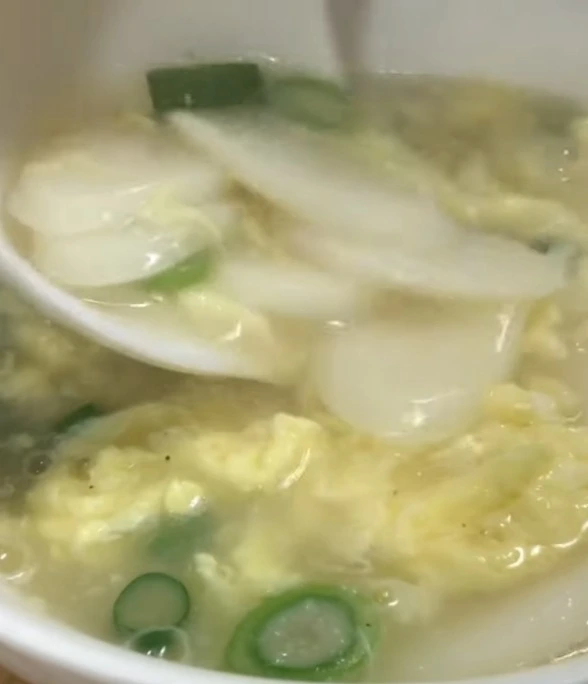노란색의 계란 꽃이 떡국에서 피어난다.
