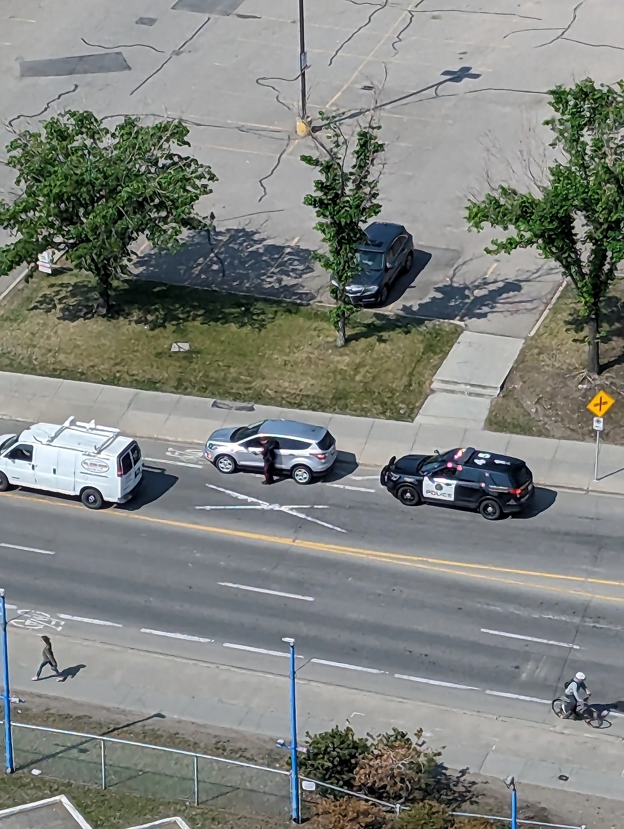 경찰차가 떠나고 차들은 여전히 오고 간다.