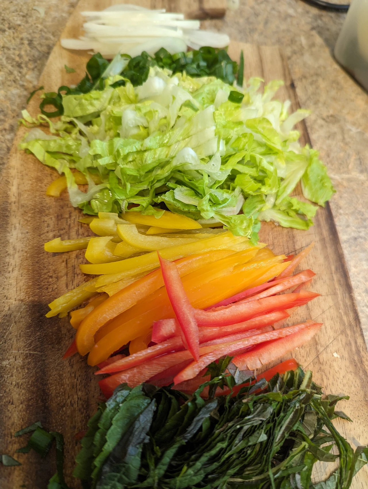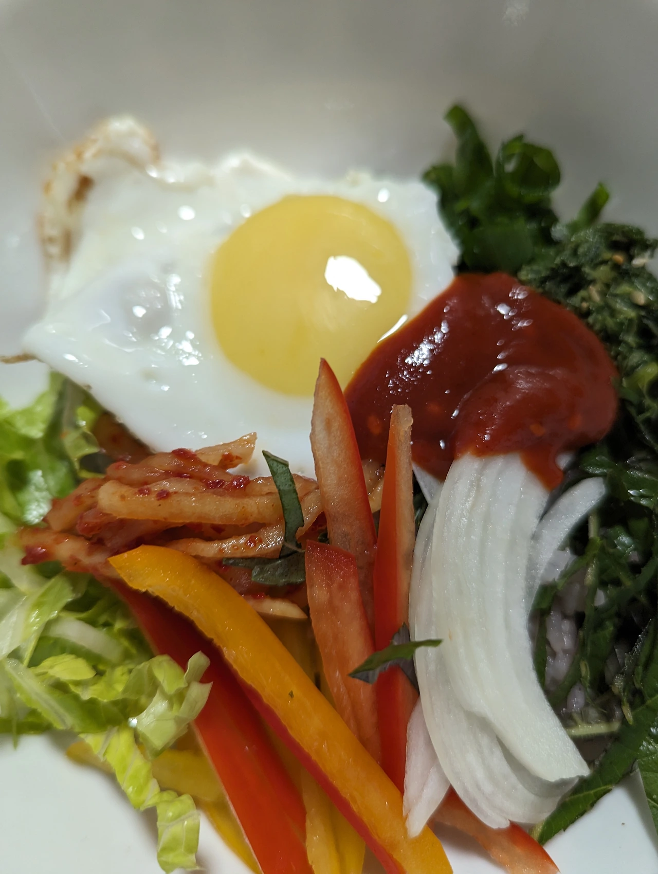 깻잎을 씻어 열 장 정도 돌돌 말아서가늘게 채를 썰어 준다.파와 부추도 짤막하게 썰고양파도 얇게 채 썰어준다.노랑 빨강 주황색의파프리카가 비빔밥에 넣어달라고 나를 쳐다본다. 얇게 채를 썰어 놓으니 무지개가 뜬것처럼 환하다. 프라이팬에 계란 프라이를 만든다. 밥을 그릇에 담아 야채를 올려놓고 계란 프라이를 올려놓으니 비빔밥에서 해님이 떠오른다. 고추장 한 숟갈에 참기름을 돌리면 고소한 냄새가 온 집안에 퍼지고 잃었던 식욕을 자극한다.