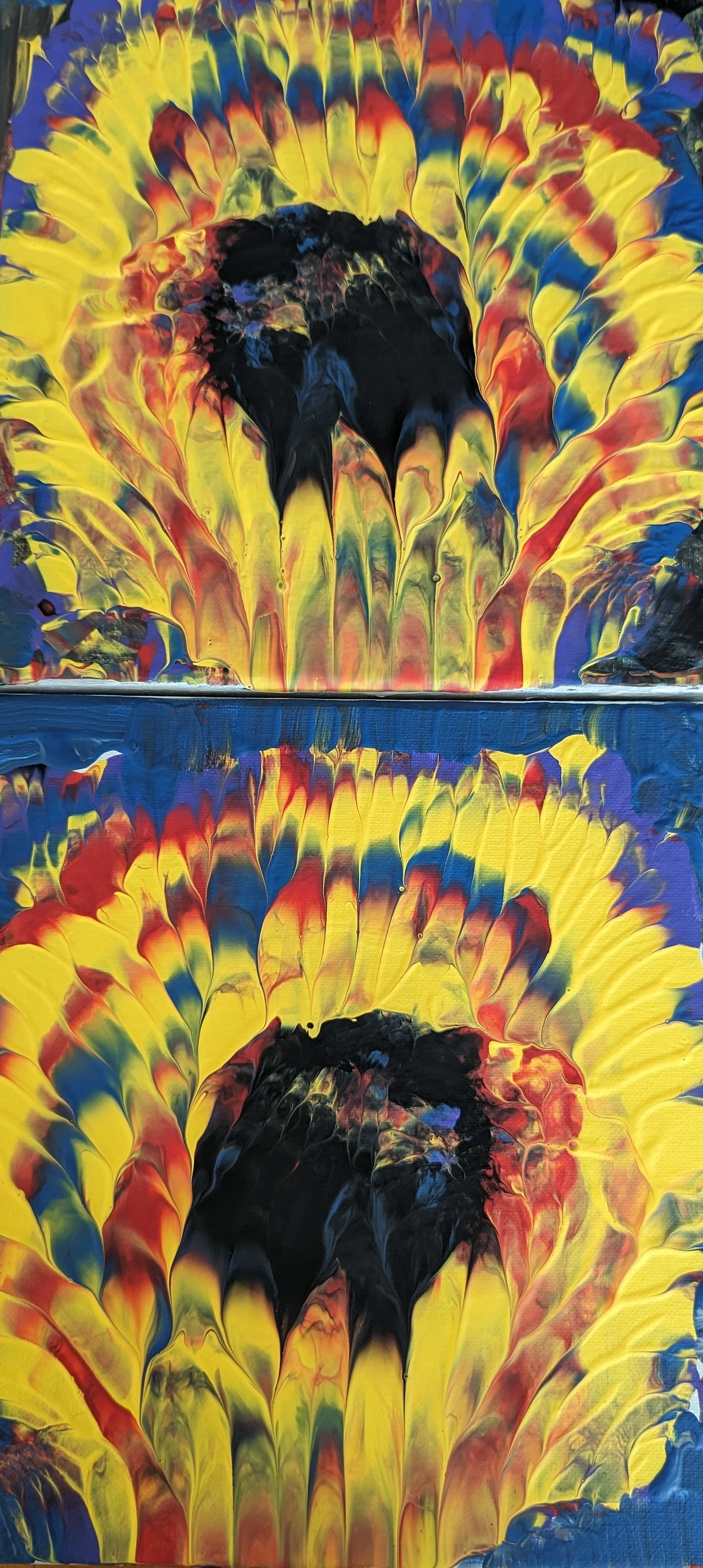 하얀 캔버스가 나의 손길을 기다린다 무엇을 그릴까 꽃을 그릴까 나무를 그릴까 아니면 도시 모습을 그릴까 생각해 본다 가을 하면 생각나는 노란 해바라기를 페인팅해 보려고 노란색 빨간색 페인트를 조금씩 짜 놓고 시작한다 페인트가 너무 묽어서 제대로 된 색이 나오지 않아 꽃모양이 잘 잡히지 않는다 아무래도 다른 방법을 써 본다 꽃모양이 잘 잡히고 꽃 색갈이 조화가 잘되게 하기 위해 평소보다 많은 양의 페인트를 캔버스에 짠다 얇은 자로 모양을 잡고 같은 크기의 캔버스를 겹쳐서 꼭꼭 눌러주고 캔버스 한쪽을 살며시 들어주며 캔버스를 분리시킨다 두 개의 똑같은 그림이 완성되어 간다 생각지 못한 두 개의 해바라기가 탄생했다