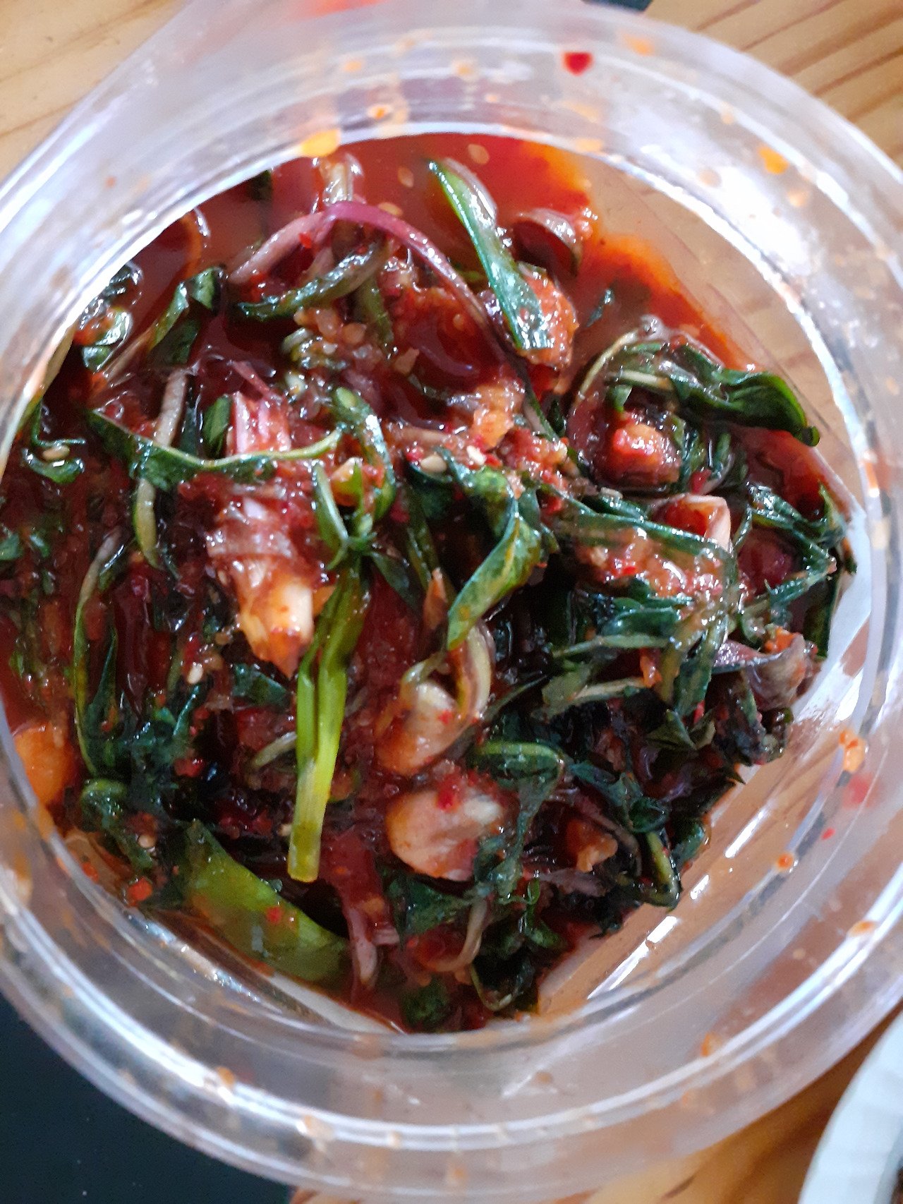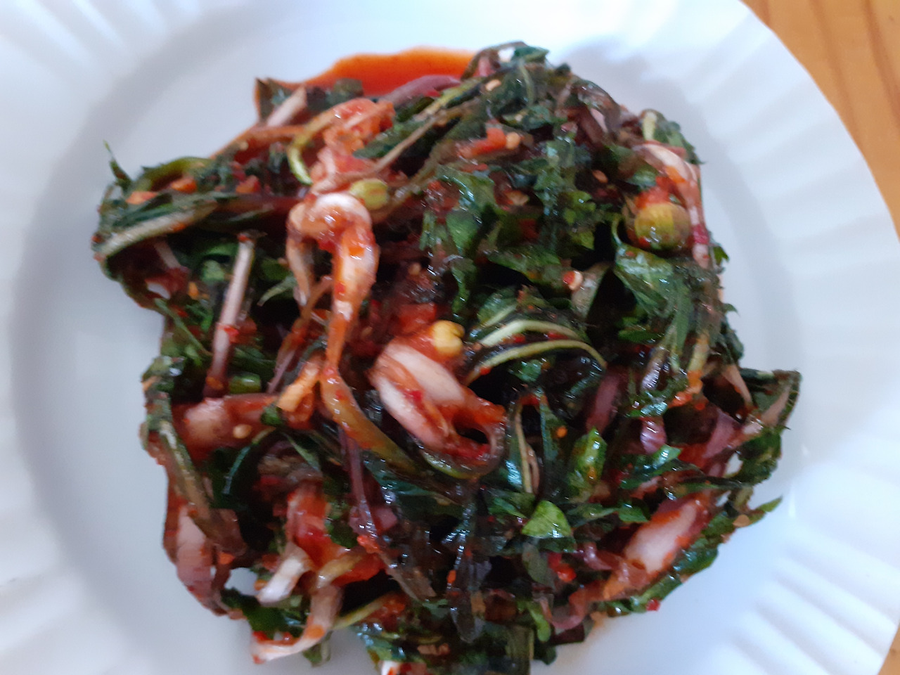 골프를 잘 치는 그녀는 골프장에 가서 골프 치면서 골프장 근처에 있는 숲 속에서 틈틈이 민들레를 캔다. 지금 캐는 민들레는 연하고 깨끗하다. 냉이나 달래가 귀한 이곳에 그나마 민들레가 흔하니 알뜰한 살림꾼인 그녀는 골프보다 민들레 캐는 재미가 더 좋단다. 커다란 비닐봉지로 한가득 채워 집에 와서 남편과 다듬는다. 다리도 아프고 허리도 아플 텐데 커다란 양푼에 하나하나 손으로 집어서 행여나 잡풀이라도 들어갈세라 눈을 크게 뜨고 깨끗이 씻은 다음 미리 준비해 둔 양념을 부어 김치를 만든다. 너무 심하게 비비면 풀내도 나고, 쌉쌀한 맛이 나오기 때문에 손가락으로 애기 다루듯 살살 양념을 섞는다. 커다란 봉투로 하나였던 민들레는 숨이 푹 죽어서 몇 분의 일로 줄기 때문에 한 접시 얻어먹는 것도 감지덕지인데 한 항아리를 받았다. 그렇게 힘들게 만든 귀한 민들레 김치인데 이렇게 앉아서 손하나 까딱하지 않고 받아먹어서 정말 미안하다.
