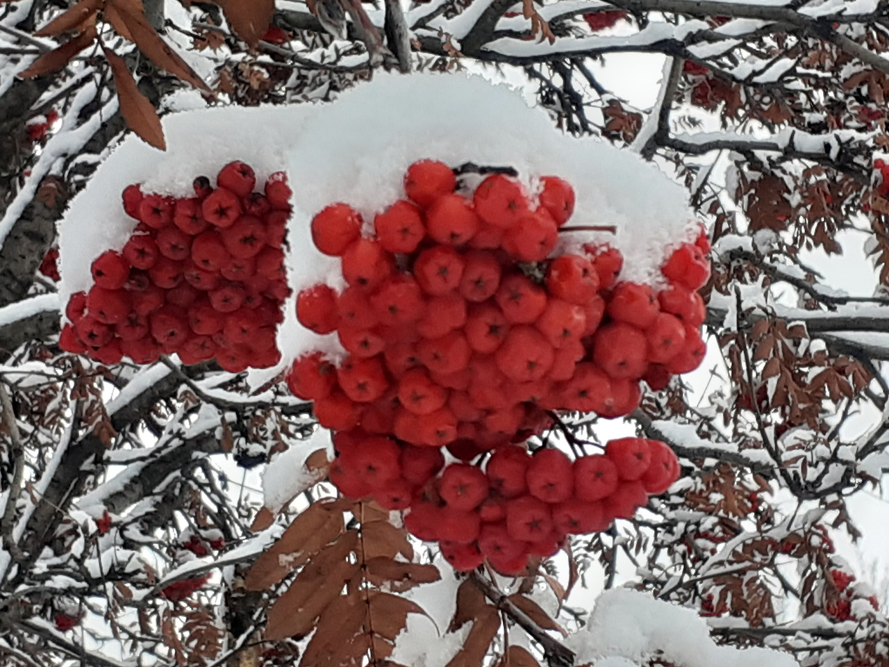 그 옆으로는 마가목 나무가 빨간 열매를 매달고 조금 전부터 내린 눈으로 하얀 모자를 쓰고 멋진 포즈를 재고 서 있고, 그 옆에는 밥풀꽃 나무가 이파리를 다 떨어 뜨린 채 앙상한 모습으로 쓸쓸히 서 있다. 아까부터 내리던 눈이 조금씩 쌓이기 시작하더니 이내 앞 뒤뜰을 하얗게 덮었다. 2월이나 3월에 오는 눈은 해가 길어 금방 녹아 버리는데 10월에 오는 눈은 쉽게 녹지 않는다. 어릴 적 첫눈이 오면 이유 없이 좋아했지만 이제는 가을을 제치고 무댓보로 쳐들어오는 겨울이 싫다. 차고 뒤쪽에는 옮겨다 놓은 몇 그루의 앵두나무와 딸기나무들이 눈을 맞으며 청승맞게 서 있고, 부엌으로 들어오는 문 옆에 있는 앵두나무는 며칠 전 영하로 떨어지는 온도로 이파리가 꽁꽁 얼어 버렸다. 봄에 꽃샘바람으로 만개했던 꽃이 얼어서 앵두를 하나도 못 따먹었는데 가을에 이파리까지 얼으니 말 못 하는 식물에게 미안한 마음이 든다.