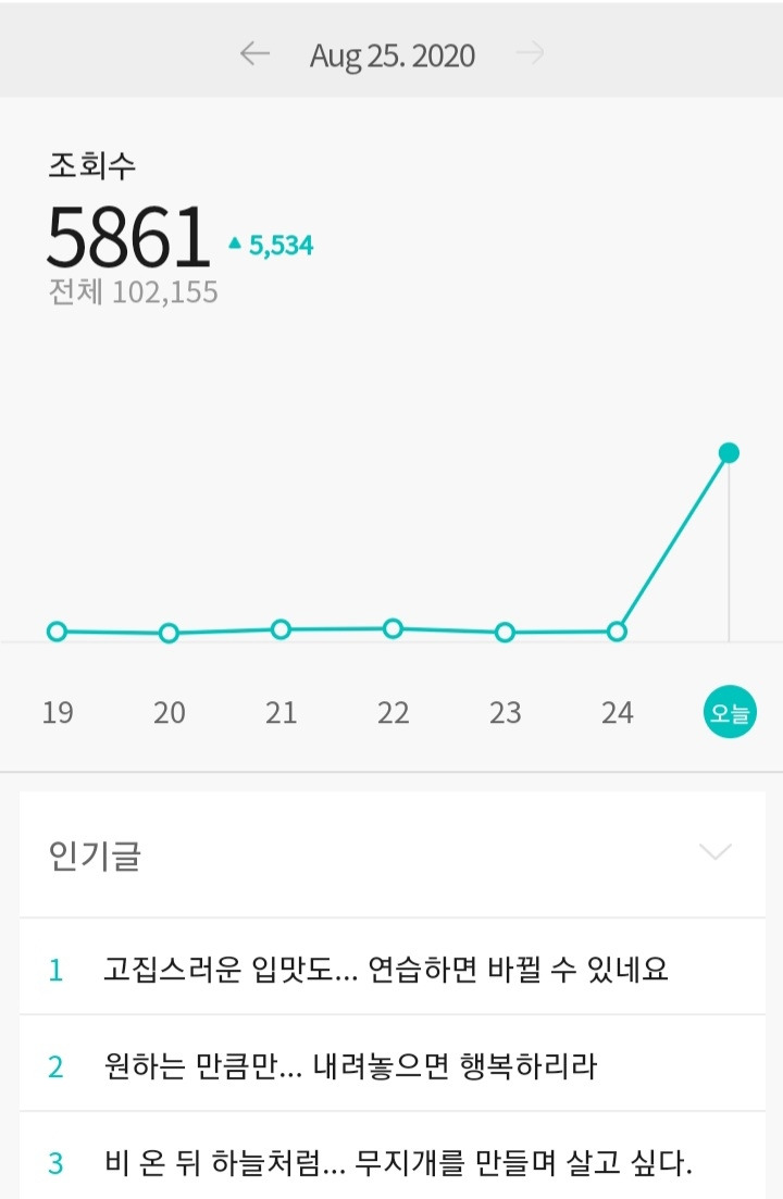 라는 글로 조회수가 빠르게 올라갔다. 어제 오후 4시 반경에 브런치에 글을 올린 후 얼마 되지 않아 알람이 계속 울려서 확인을 했는데 한 시간 만에 조회수가 2000이 넘었다는 알람이 떴다. 그러려니 했더니 조금 후에 3000 그리고 4000이라는 말에 다음메인창으로 들어가 보았더니 그곳에 내 글이 올려져 있었다. 폭발적인 조회수가 껑충 뛰는 경험을 여러 번 했지만 이번에 총조회수가 10만을 넘기는 것을 보니 나도 모르게 짜릿하다. 어제 아침 총조회수는 9만 몇천이었는데 오늘 오후에 받아본 6000이라는 조회수로 10만이 훌쩍 넘었다.'매일 하나'라는 나만의 계획으로 글을 써온지 8개월이다. 아무런 생각이 나지 않다가도 시간이 되면 마음을 담아 글을 쓰고 발행을 해왔다.