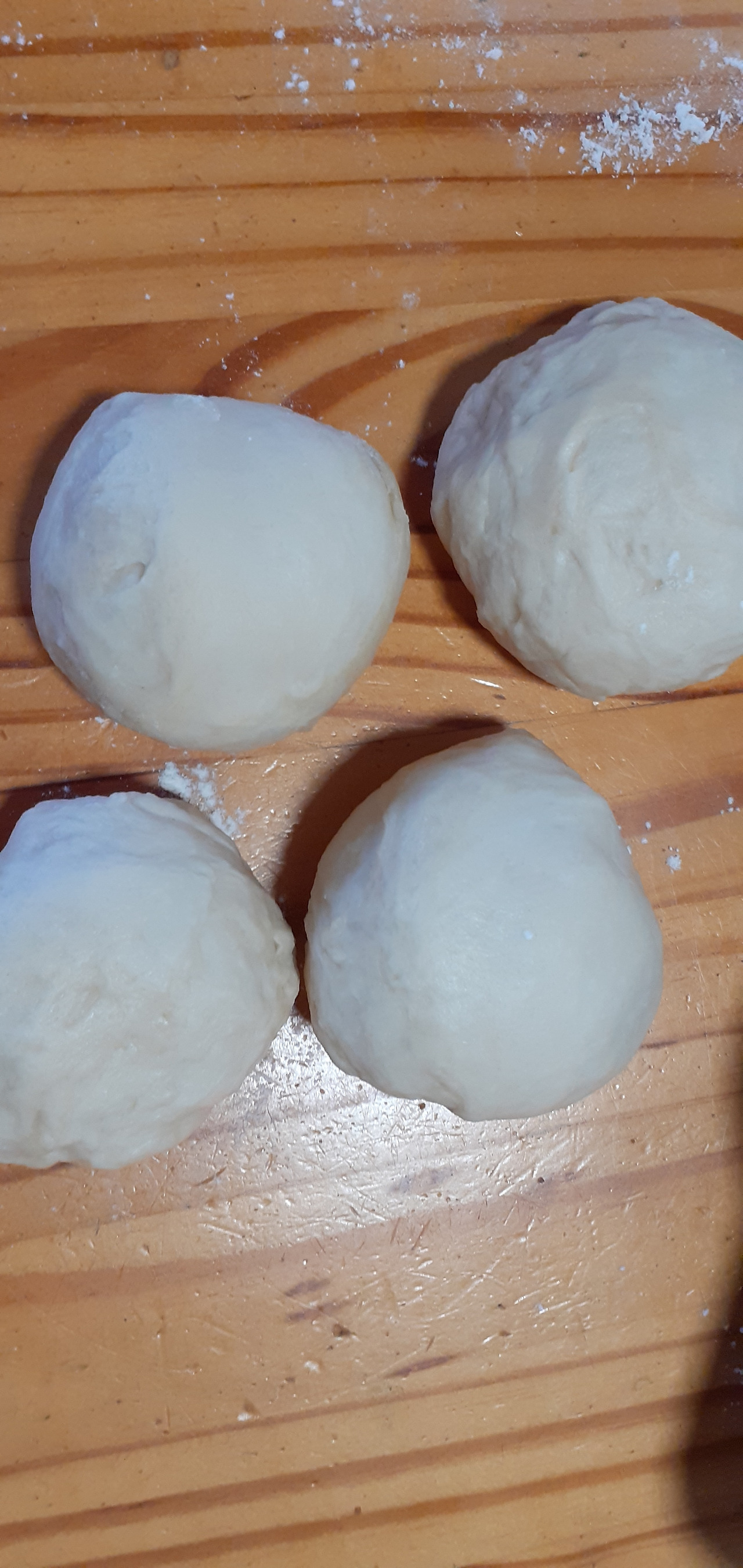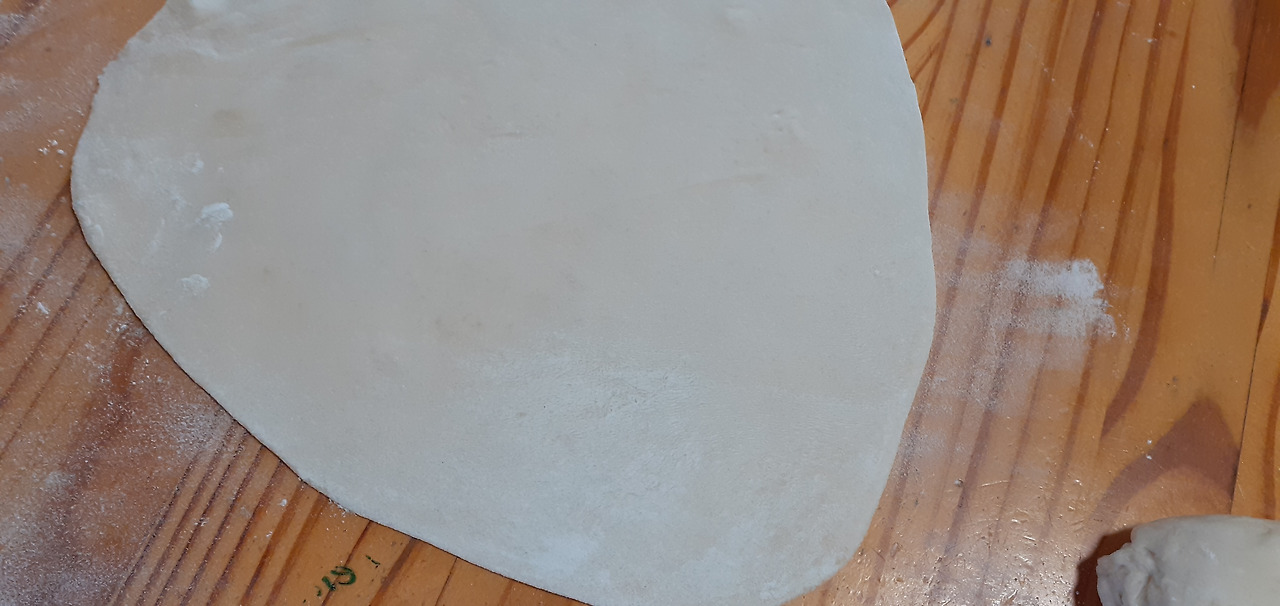 익반죽 한 반죽을 비닐봉지에 넣어 냉장고에 10분 정도 숙성시킨다. 반죽을 꺼내어 몇 번 더 주물러준다 반죽을 주먹만 한 크기로 자른다. 동글동글한 반죽에 밀가루를 조금씩 뿌려서 납작하게 만들어 밀대로 밀어준다 부드러운 반죽은 미는 대로 모양이 잡힌다 두꺼운 곳은 더 밀어주고 들어간 곳은 밖으로 내놓으며 동그랗게 모양을 잡아준다.