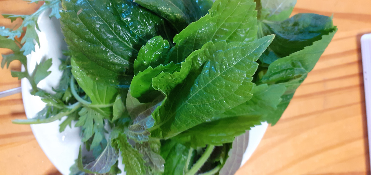 육수는 마른 새우 한 줌에 순 생선살 어묵으로 했다 호박과 양파를 채 썰어 마늘과 소금을 넣고 살짝 볶아 놓았다. 고명으로는 깻잎과 청양고추 그리고 파와 구워서 잘게 부순 김 뜨거운 육수에 들어간 칼국수는 신나게 춤을 추며 끓어오른다