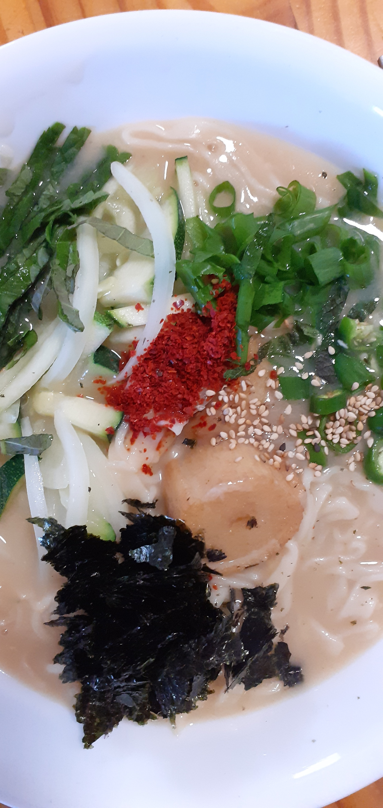 간장과 소금 생강과 마늘을 넣고 멸치액젓 한 숟가락 넣어 간을 맞춘다 캬…. 이 맛이야 당연하지 세련된 조교와 함께 만든 손칼국수는 이렇게 완성되었다 그릇에 국수를 담고 여러 가지 고명을 올리고 참기름을 한 방울 뿌려주고 고춧가루를 원하는 만큼 넣어서 먹으면 완성이다