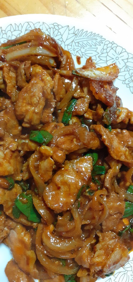도마에 또 다른 한 덩어리를 얇게 썰어서 프라이팬에 기름을 두르고 고추장과 고춧가루를 넣고 간장과 마늘과 생강을 넣어 양파와 볶는다. 참기름 한 방울과 설탕 한 숟갈을 넣어 볶은 다음 파릇파릇한 파를 고명으로 올려준다.