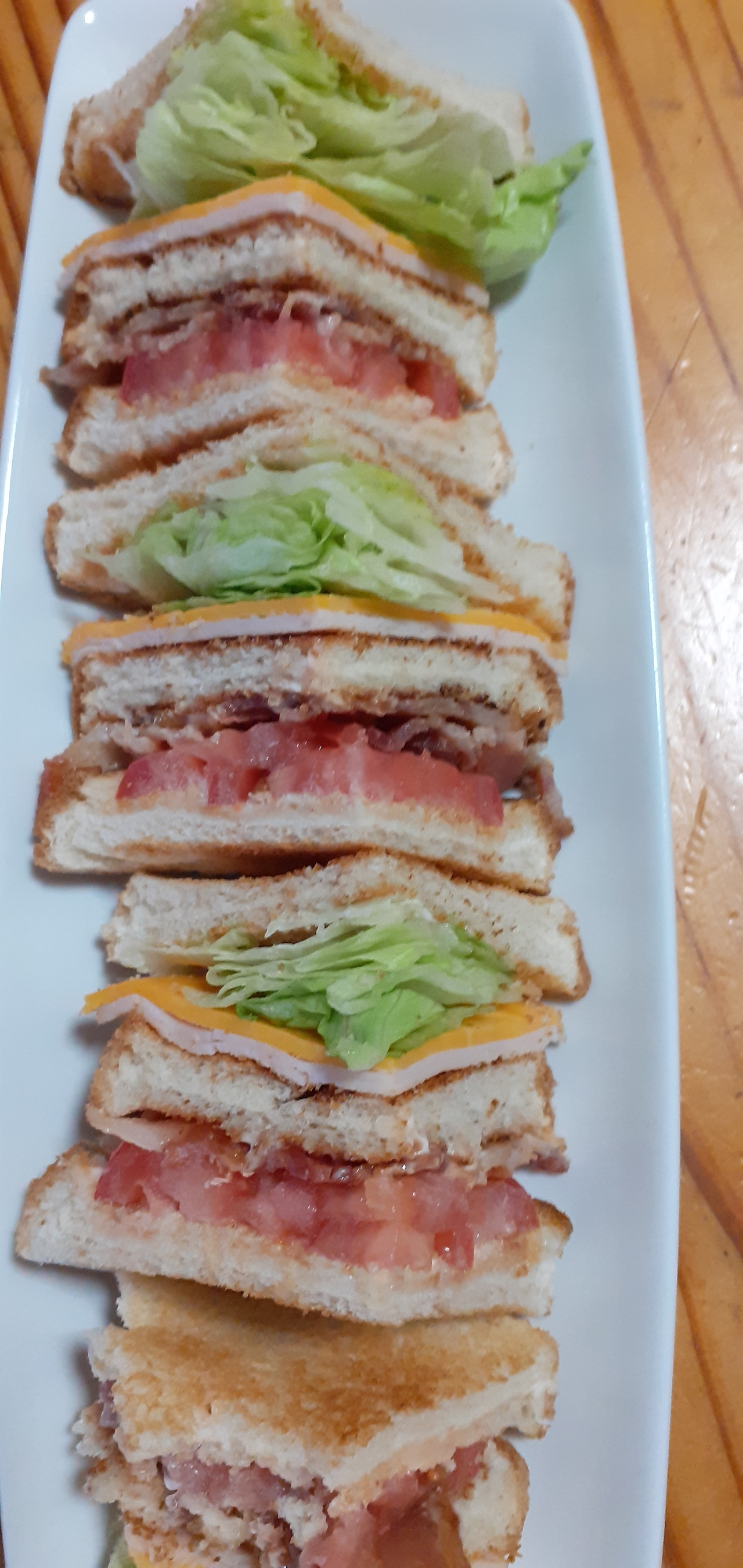 1. 빵 3쪽을 토스트 하여 마요네즈를 바른다. 2. 빵을 한쪽 놓고 토마토 2쪽을 얹는다. 3. 구운 베이컨 두 개를 반을 잘라서 토마토 위에 얹는다. 4. 토스트 한 빵 하나를 베이컨 위에 얹는다. 5. 빵 위에 터키 고기를 얹고 치즈를 올리고 양상추를 올려놓는다. 6. 양상추 위에 토스트 한 장을 얹고 7. 사방에 나무 꼬챙이로 고정시킨다. 8. 샌드위치를 비스듬히 잘라 2등분이 되면 9. 다시 반으로 잘라서 샌드위치 4개를 만든다. 10. 예쁘게 접시에 담아 양배추로 만든 콜 슬러와 함께 먹는다.
