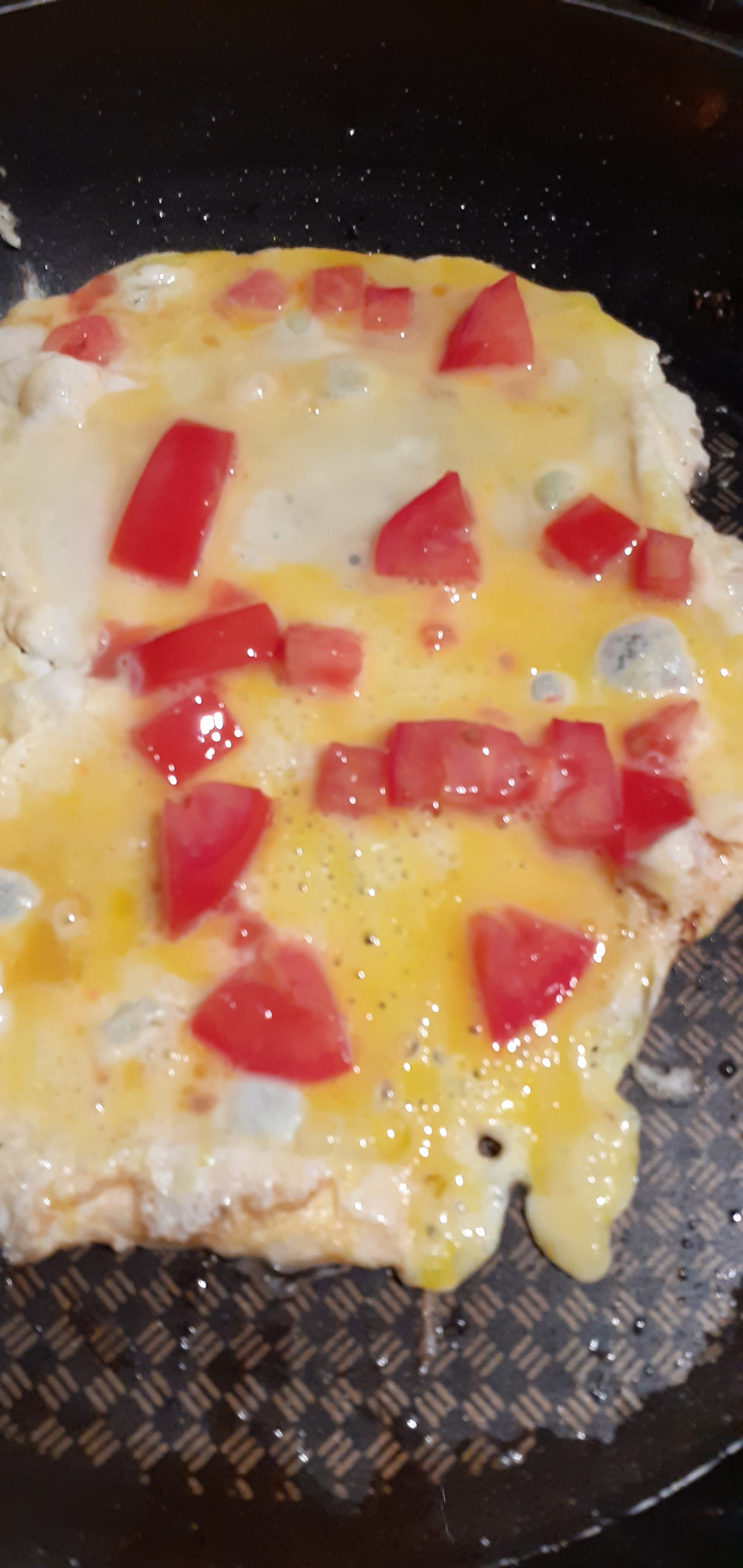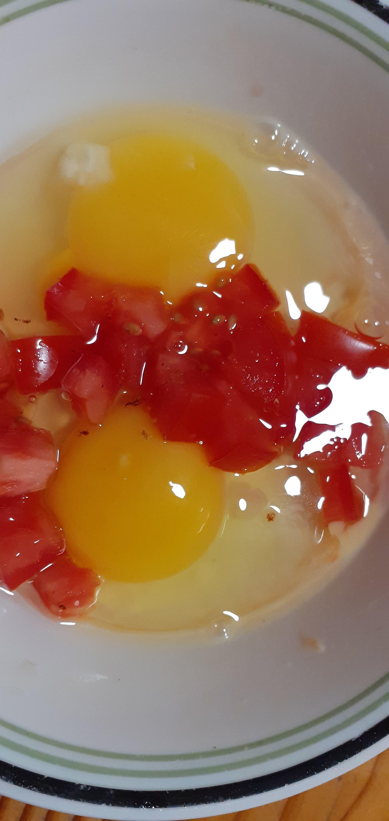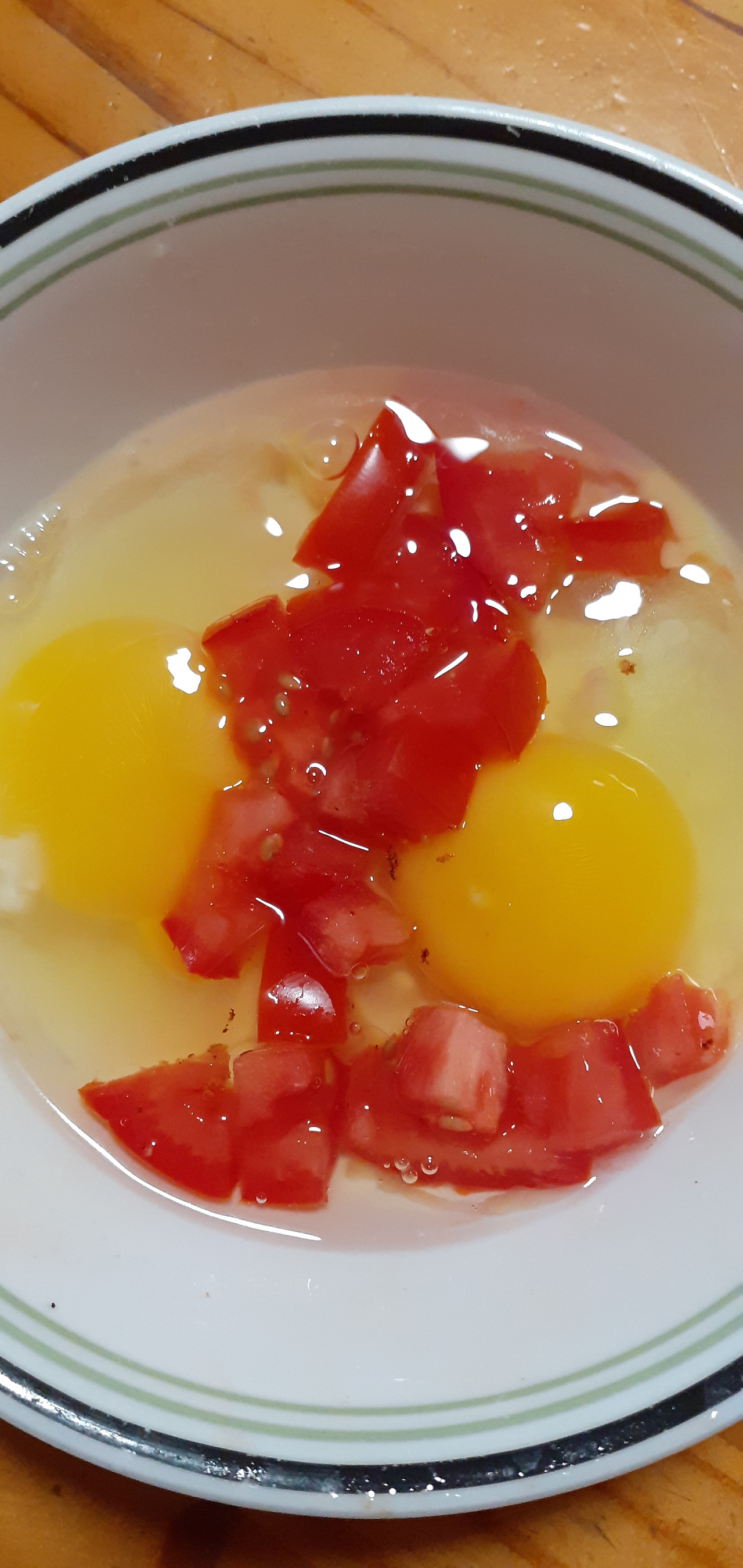 계란 두 개와 잘게 자른 토마토를 넣어