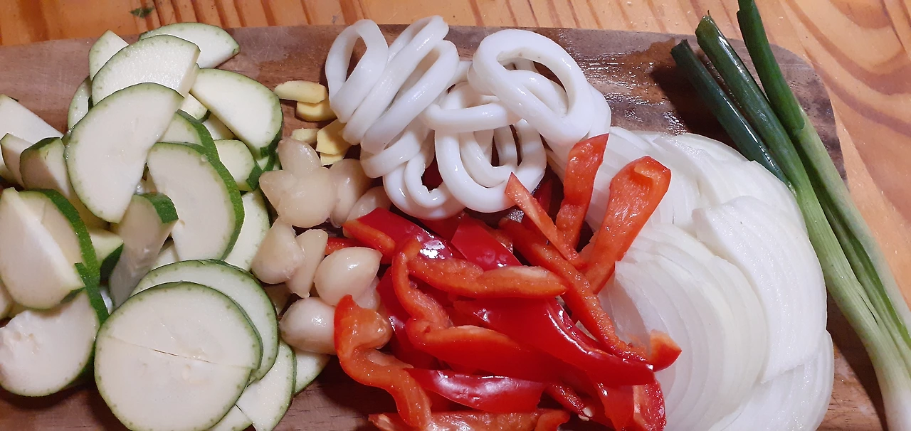 호박 양파 빨간 피망과 오징어를 넣고