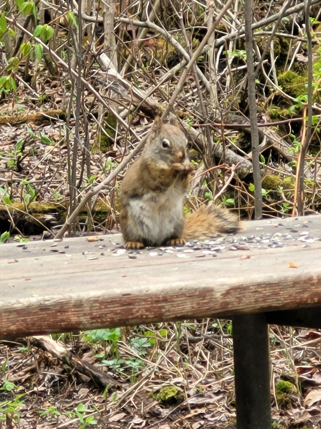 눈폭탄을 맞은 꽃들이 기운을 차리고 살아났다. 몇 개는 여전히 엄살을 부리며 누워서 능청을 떨고 있지만 다들 죽을 고비를 넘겼다. 하늘은 맑고 바람도 없어 밀렸던 산책을 나간다. 며칠 전 온 눈으로 길이 질퍽하여 숲 속의 오솔길을 걷기 힘들 것 같아 넓은 산책길로 걷는다. 요즘엔 하루가 다르게 숲이 우거진다. 눈 온 끝이라서 기온이 낮아 두꺼운 옷을 입고 한적한 곳을 걸어본다. 누군가 피크닉 테이블에 놓아두고 간 해바라기씨를 다람쥐가 열심히 먹는다. 사람들이 지나가거나 말거나 고픈 배를 채우느라 열심히 먹길래 사진 몇 장 찍고 지나친다. 모자를 썼는데도 목덜미가 써늘해서 재킷에 달린 모자를 더 쓰고 걸어본다.이른 시간도 아닌데 아주 춥다. 아무리 추워도 15분 정도 걷다 보면 더워지니까 10분만 더 참자며 앞으로 전진한다.