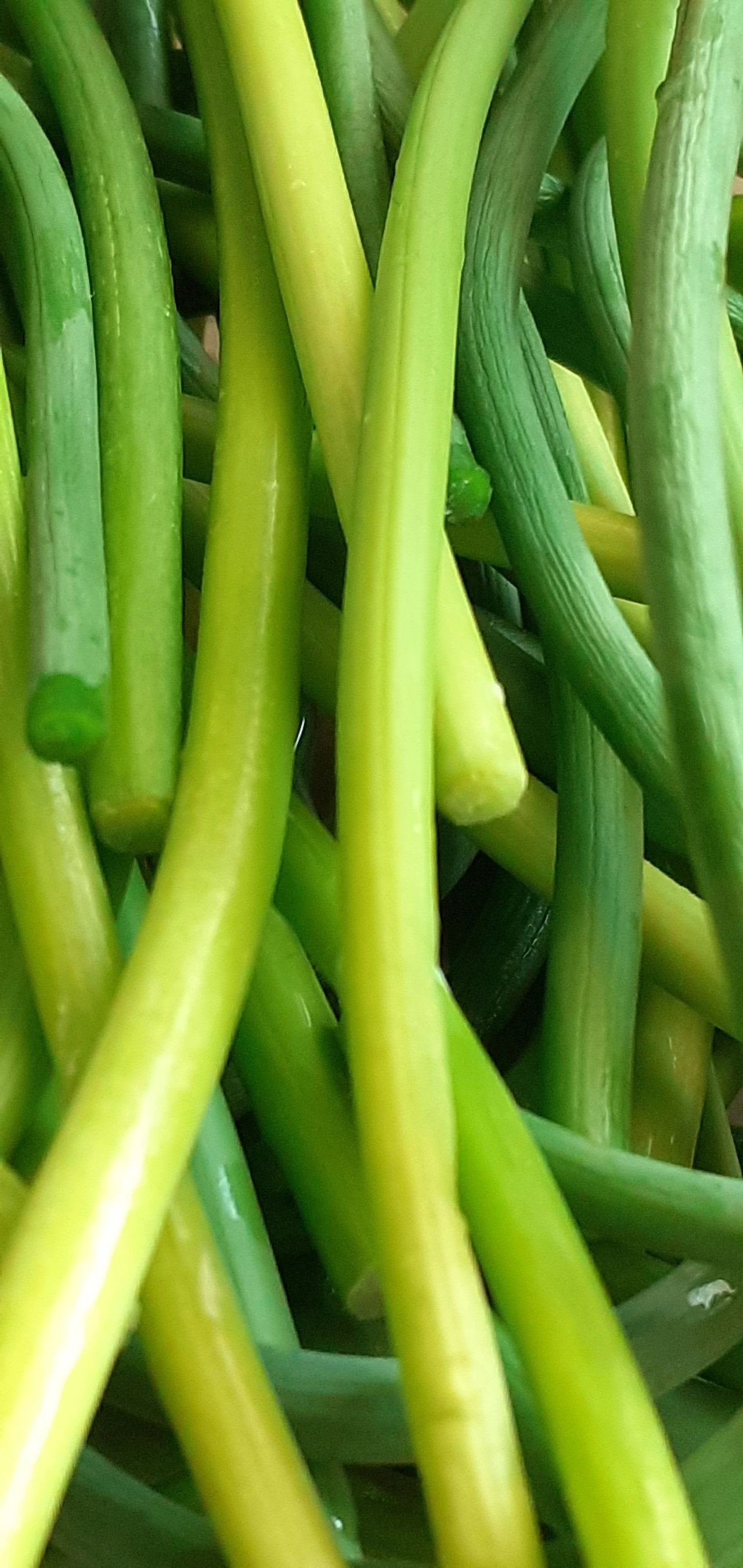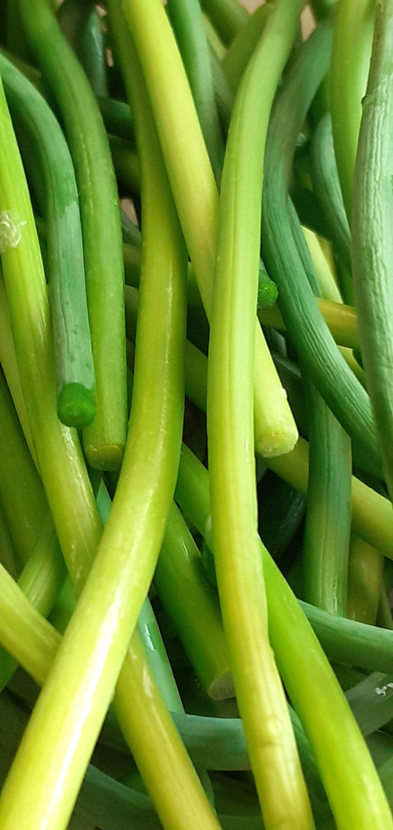 새파란 마늘종과 새빨간 당근이 얼싸안고 좋아한다.