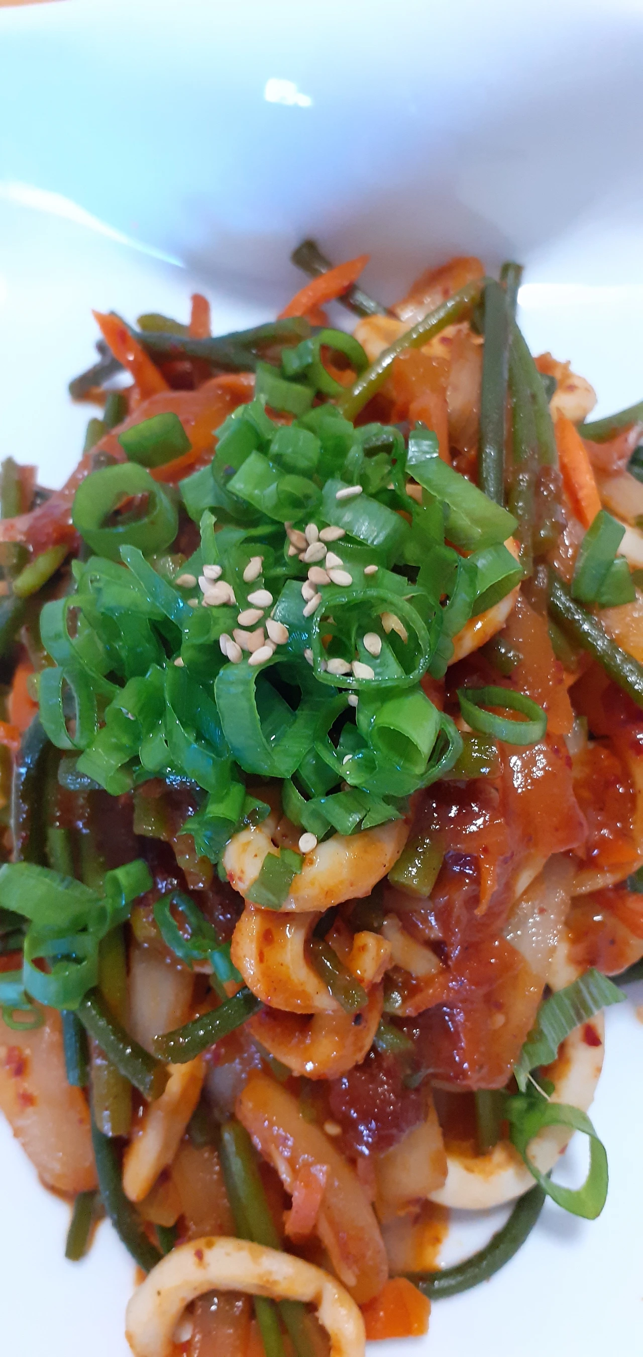 하얀 접시에 곱게 물든 오징어 볶음을 가지런히 예쁘게 담고 위에 파도 몇 개 더 얹으면 근사한 오징어볶음 한 접시가 만들어진다. 나도 모르게 침을 꼴깍 삼킨다.