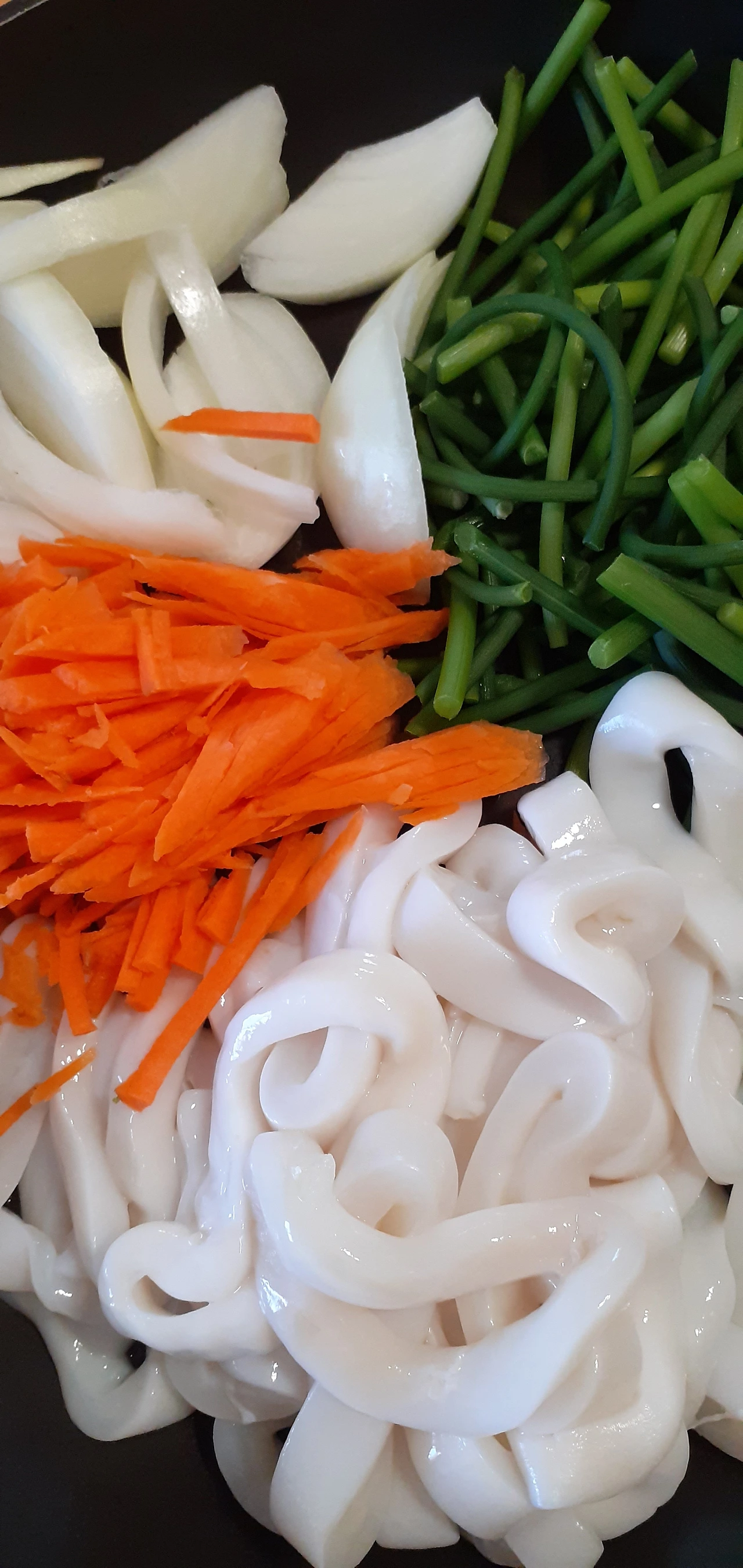 프라이팬에서 만난 오징어와 야채들이 반갑다고 지글지글 소리를 내며 익어간다.
