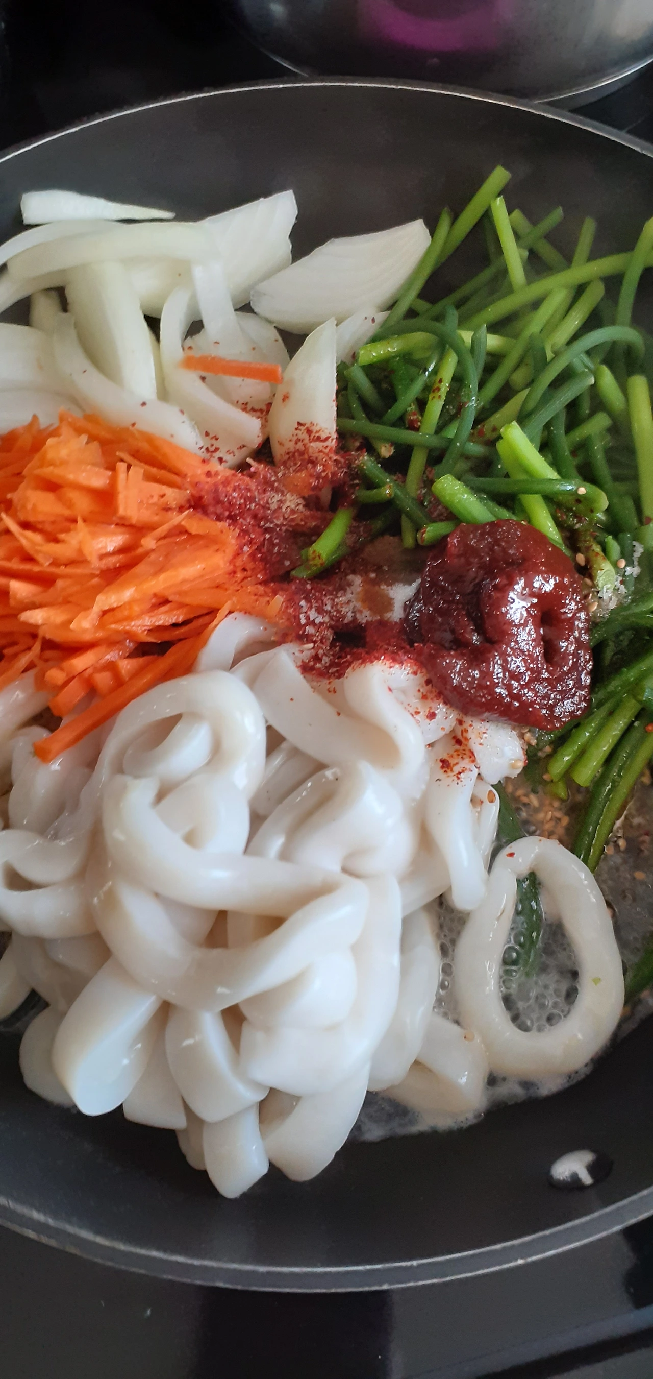고춧가루와 고추장을 입은 양파와 오징어도 덩달아 춤을 추며 프라이팬에 살짝 눕는다.