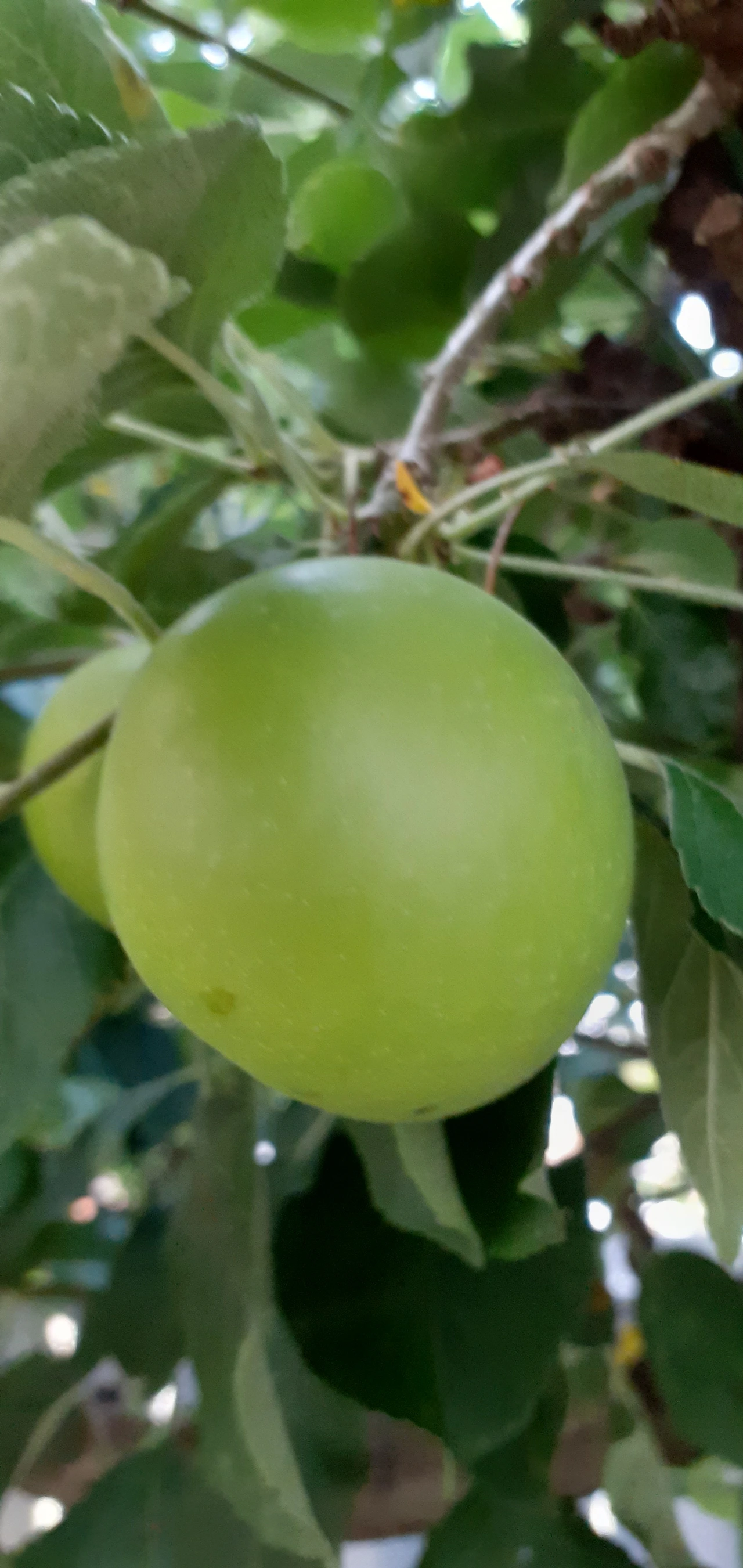 호박순은 기둥을 타고 오르기를 좋아하는데 옆에 있는 사과나무를 타고 위로 뻗어 올라간다. 매일 머리 숙이고 텃밭에 있는 야채들과 이야기하는 사이에 사과가 주먹만 하게 자라고 있다. 사과가 자란 줄도 모르고 야채들만 예쁘다, 잘 자라라, 고맙다고 했으니 혼자 자란 사과한테 미안하다. 새파란 사과를 보니 입안에 침이 고인다. 사과나무 중 하나는 8월 하순이면 떨어지는 조생종이고 다른 나무는 10월 중순에 눈이 오고 서리가 와야만 따먹는 만생종이다. 그렇게 추수한 사과는 달콤하고 싱그럽고 물이 많다. 과일로 먹고 사과잼을 만들기도 하고 사과파이를 만들기도 한다. 빨갛게 익은 사과를 지나가는 사람들이 따먹기도 하고 지인들과 나누어 먹기도 한다. 상품가치가 없지만 농약 한번 쓰지 않는 오가닉이니 옷에 쓱쓱 문질러서 한번 깨물어 먹는 맛은 기가 막히게 맛있다.