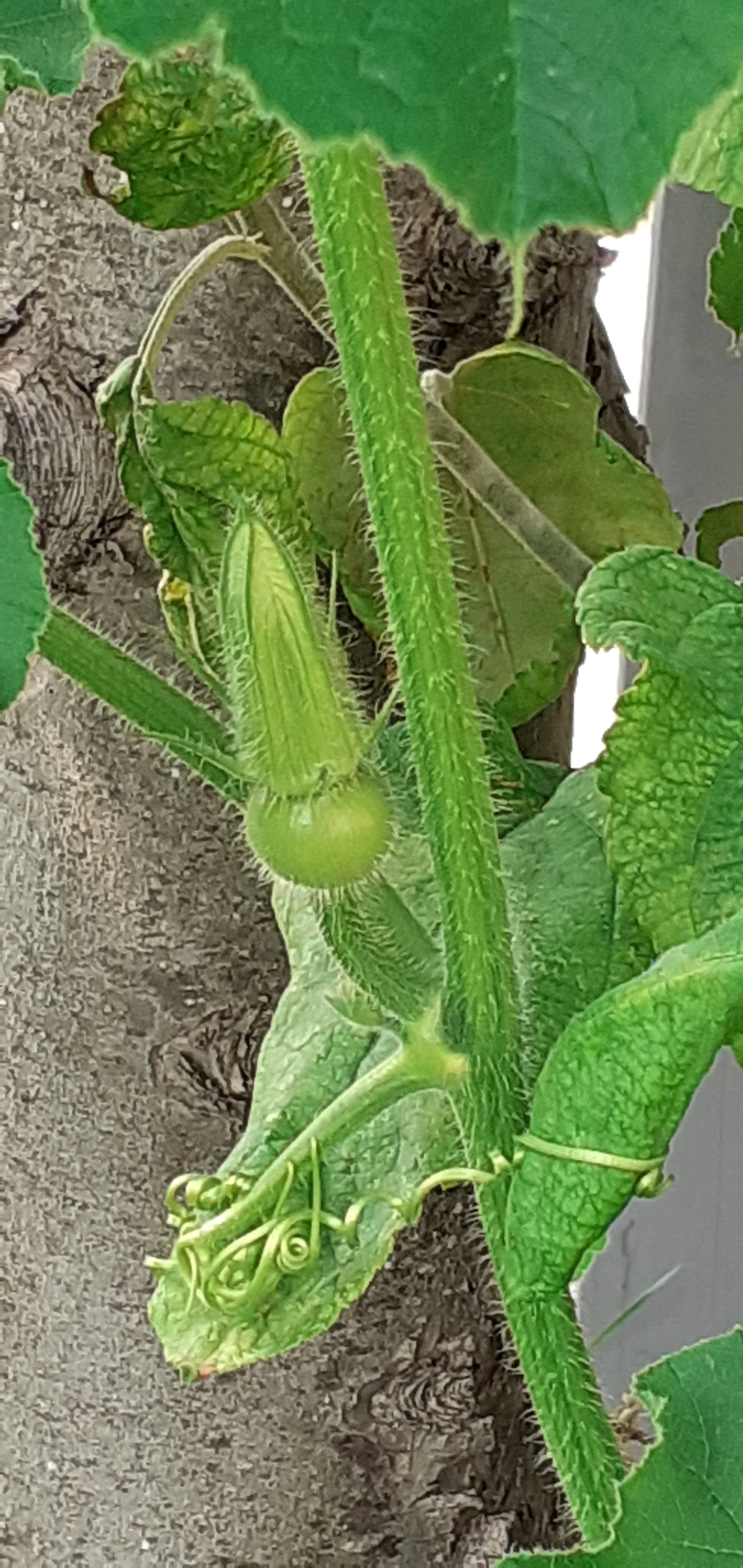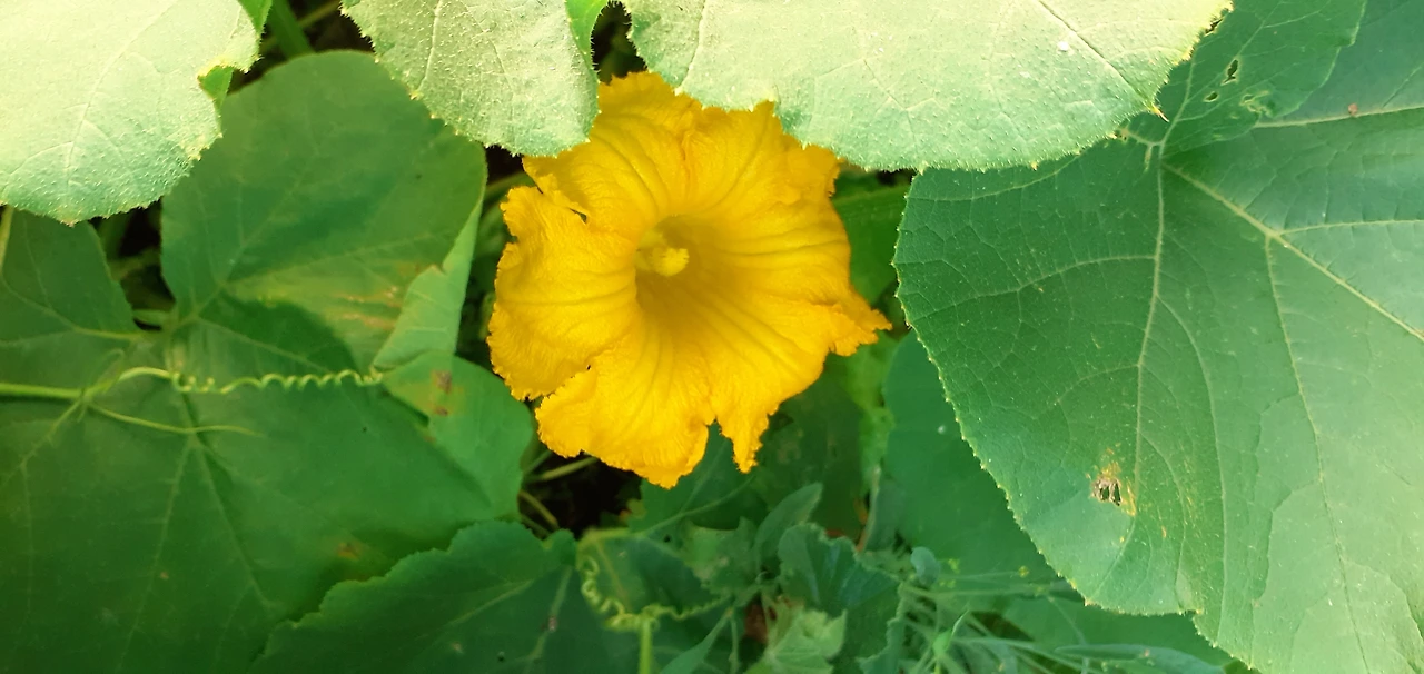 지난겨울에 단호박을 하나 사다 먹을 때 봄이 오면 밭에 심어 보려고 호박씨를 바싹 말려서 보관해 놓았다. 봄에 씨앗을 뿌리고 모종을 심을 때 호박씨도 화분에 몇 개씩 넣어 놓았는데 어느새 보니 동글동글한 싹이 흙을 뚫고 세상으로 나와 있는 게 보였다. 하나 둘 꺼내어 텃밭에 여기저기 심어주고 지인들과 조금씩 나눴다. 호박잎이 풍성하여 꽃은 언제 피려나 했더니 아침에 나가보니 노란 꽃이 아침 인사를 한다. 수꽃이 대부분이지만 그래도 암꽃이 몇 개 있어 앵두만 한 단호박을 달고 있는 모습이 앙증맞다. 호박잎이 무성해서 밭을 덮어 그늘에서 자라는 상추가 뜨거운 여름도 잘 버티고 있다.