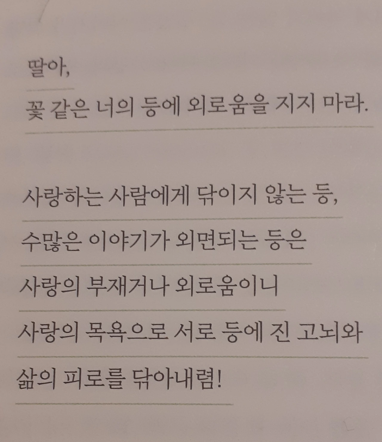 꽃 하나가 피기 위해서는 참고 기다리며 사랑하지 않으면 안 된다. 시집가는 딸의 행복한 삶은 자신의 행복임을 알기 때문에 인간으로 살기를 간절히 바라는 엄마의 사랑이 넘치는 저자의 마음을 읽는다.