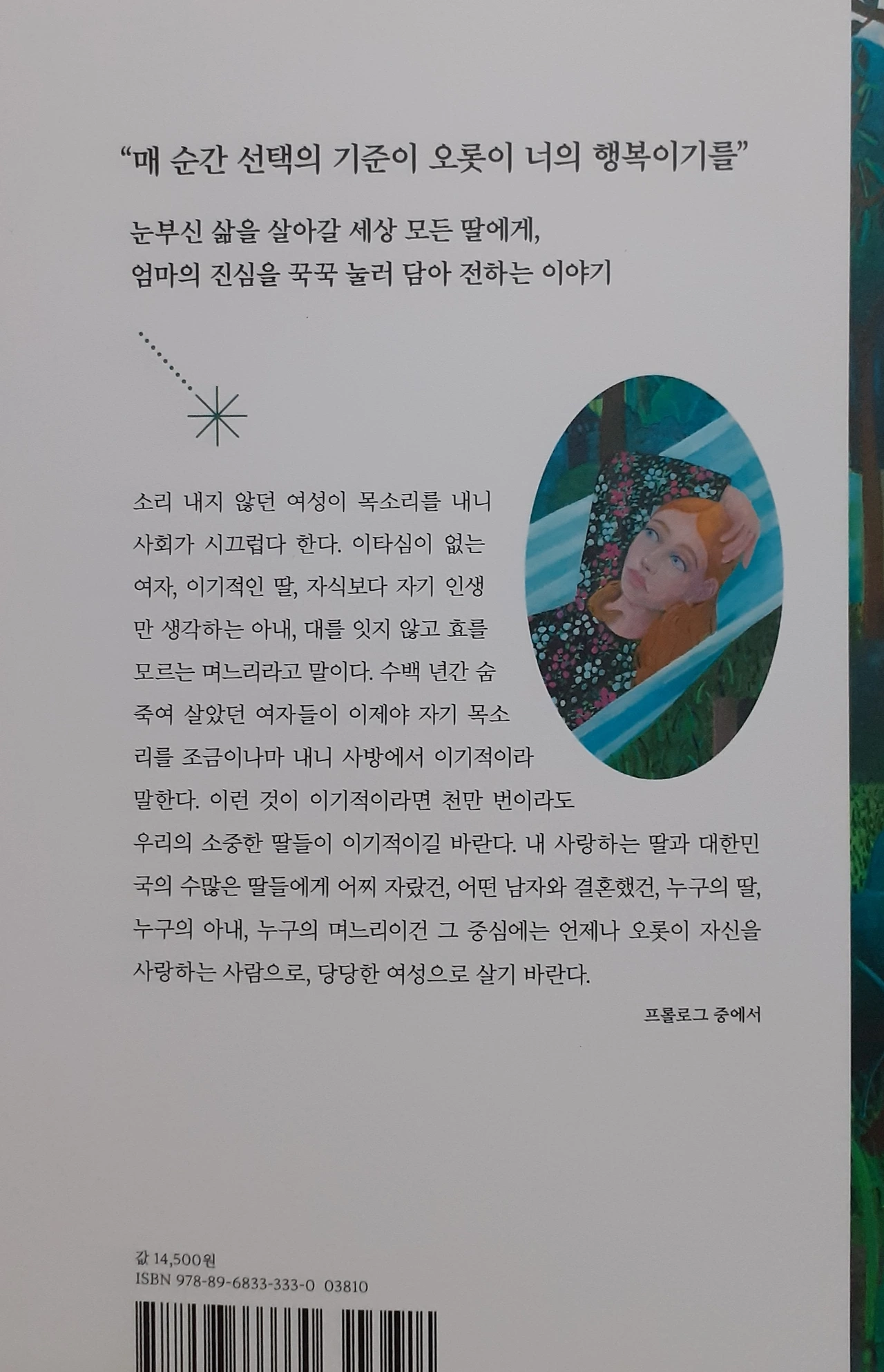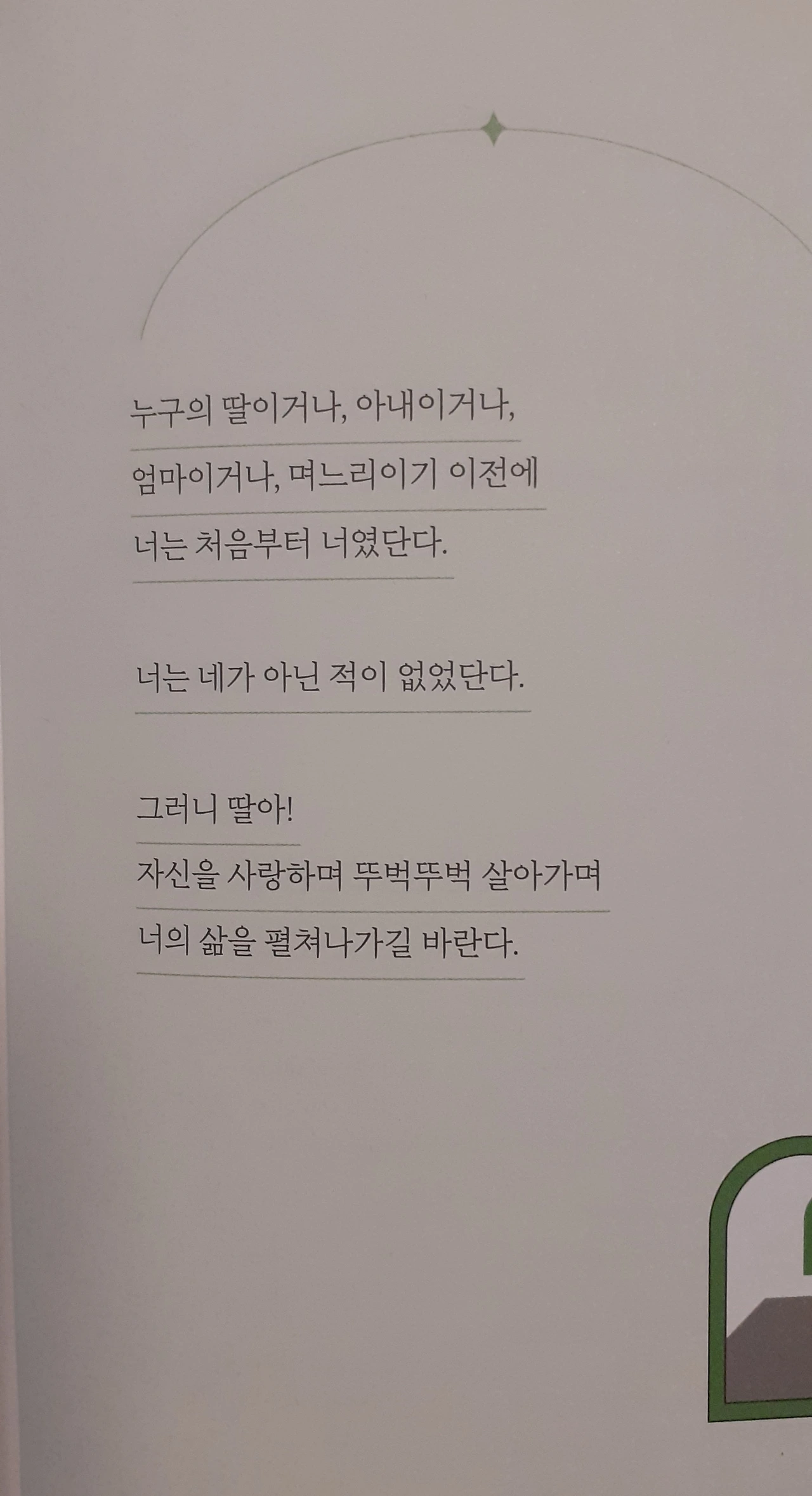 삶을 거부하는 대신에 시종일관 수용하고 미소를 잃지 않으며 자신의 신앙 속에 사신 친정엄마를 보며 자란다. 소박한 꿈을 소중한 꿈으로 알고 사신 엄마의 삶이 싫어 모르는 체하며 자신의 꿈을 위해 이기적이 되어야 했던 저자는 이기적인 것이 아니고 자신의 삶을 찾기 위한 길을 걸은 것이다. 주위의 반대에도 주저앉지 않고 피나는 노력으로 본인의 삶을 위해, 본인의 뜻을 이루기 위해 살아온 저자는 이제 딸도 이기적인 삶을 살기를 바란다.