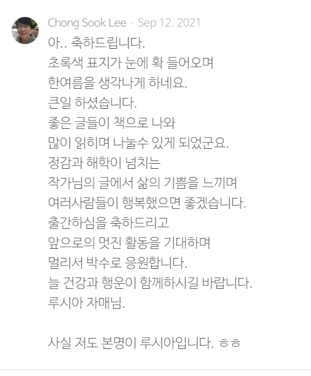 교수로서, 엄마와 아내로서, 며느리와 딸로서, 이제는 친정엄마로 열심히 살아오며 꿈을 향해 걸어가는 작가님의 앞날에 밝은 태양이 비춘다. 딸의 행복을 위함이라면 자신의 존재를 잊어도 된다며 넘치는 사랑으로 딸의 행복을 기원하며 글을 맺는 작가님의 책을 읽으며 가슴으로부터 강렬하게 흘러나오는 모정에 고개 숙인다. 진정 엄마는 위대하다.