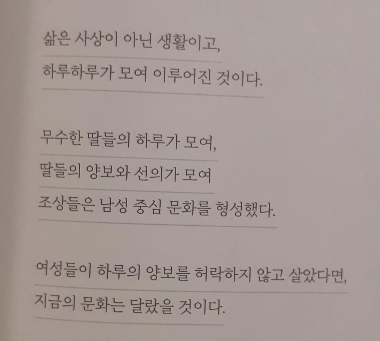 인식은 시대에 따라 서서히 변한다. 우리가 믿었던 것들이 잘못된 것을 알고 고치며 적응하며 살아간다. 그때는 모두 그렇게 사는 것이 최선이었듯이 현대는 또 다른 방식으로 각자의 삶을 살아가는 것이다.