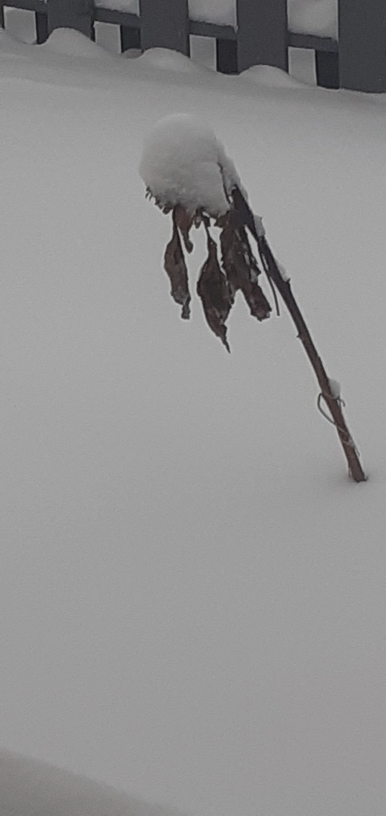 눈 내린 텃밭을 지키고 서있는 해바라기는