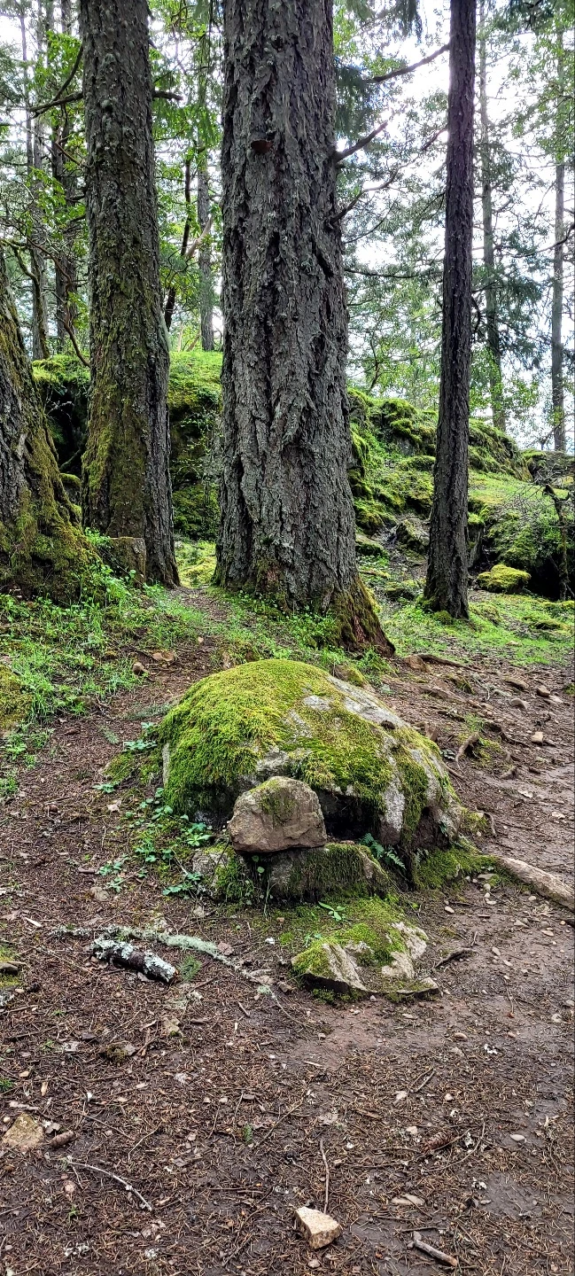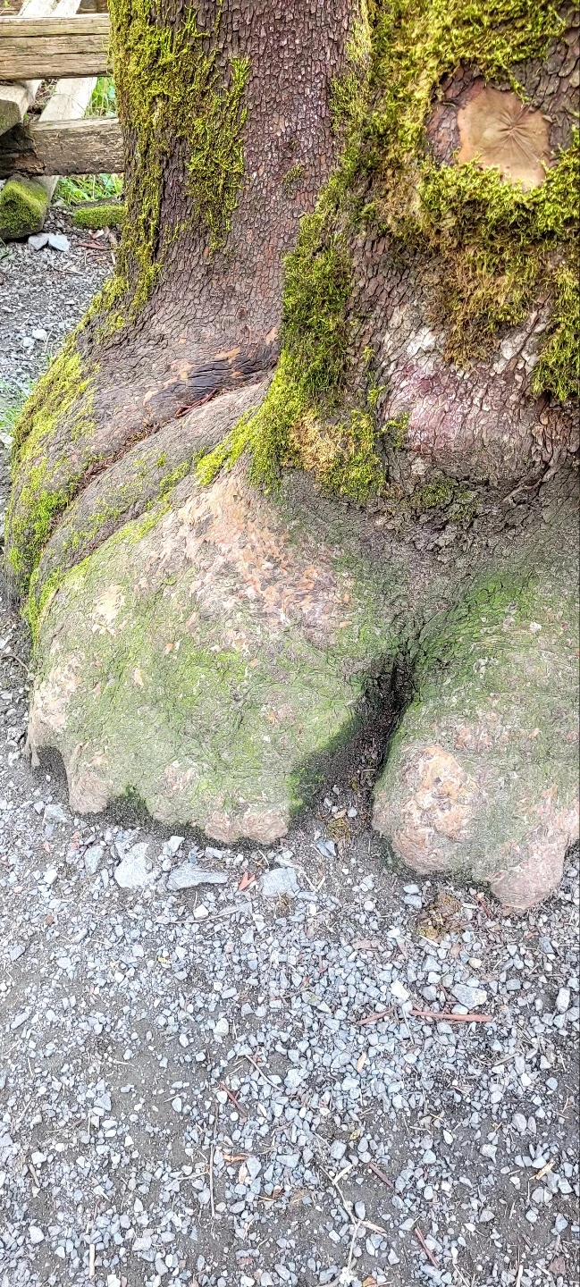 우연히 땅을 내려다보았는데 나뭇잎들과 풀 사이에 가래떡 굵기의 연두색 달팽이가 누워있다. 징그럽지만 너무나 신기해서 남편이 나뭇가지로 살짝 건드려보니 다리를 움츠리며 몸을 오그린다. 그냥 지나쳤으면 모를 정도로 나뭇잎과 똑같다. 수많은 종류의 크고 작은 나무들이 서로를 바라보며 사이좋게 서 있다. 굵고 가늘고 자라면서 껍질이 벗겨지는 나무가 있고 비틀어져 허리를 구부린 채 몇백 년을 서 있는 나무도 있다. 걷다 보니 나무뿌리가 코끼리 발같이 생긴 나무가 길가에 있다. 사람의 얼굴이 다르듯 나무도 같은 것이 하나도 없다.