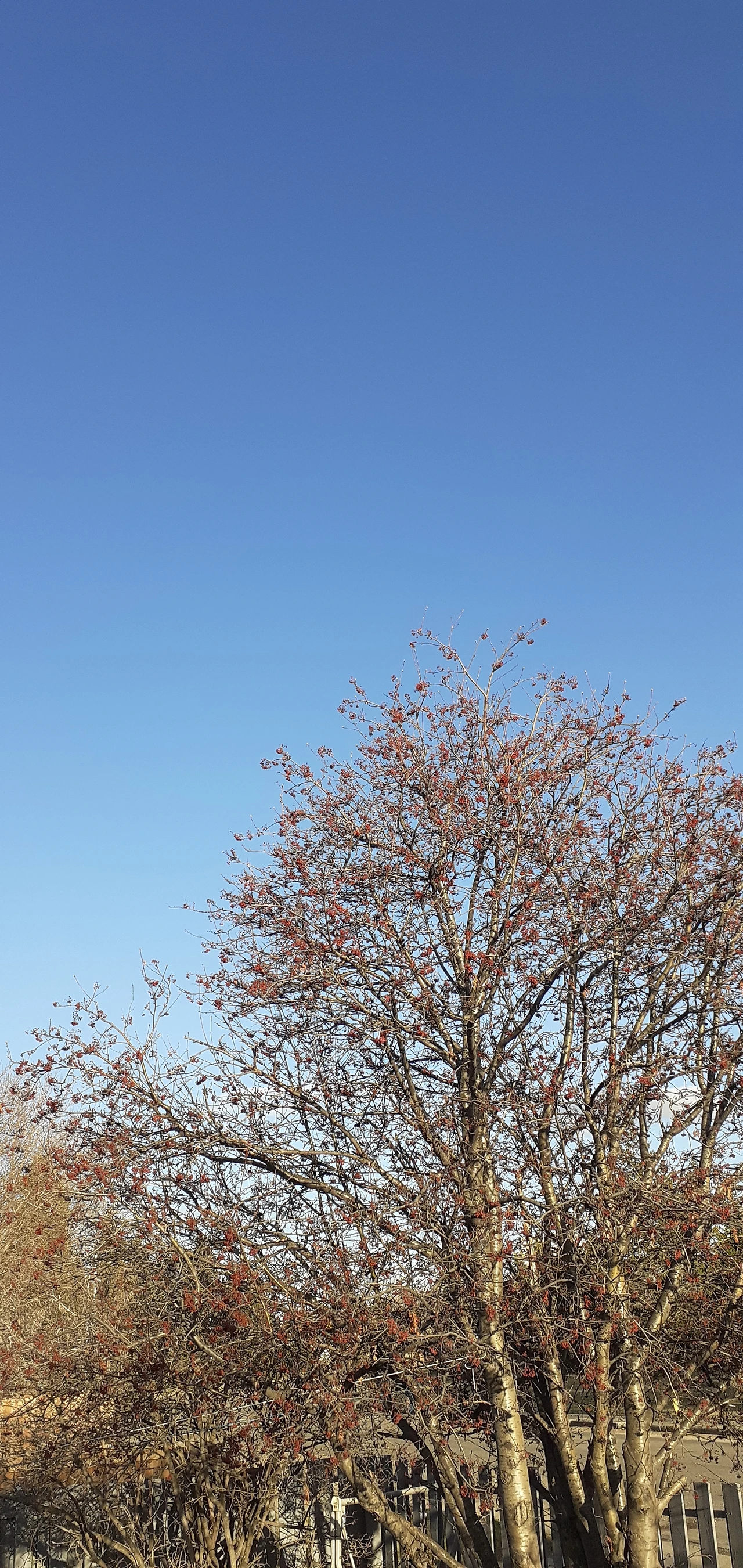 아직은 작년에 맺은 열매와 함께 살아가는 마가목 나무가 쭈글쭈글한 빨간 열매를 매달고 서 있다. 머지않아 예쁜 하얀 꽃을 피고 연두색 열매를 맺을 것이다. 마가목 나무 열매는 날씨가 추워지기 시작하면 주홍색으로 변하다가 아주 추운 겨울에는 새빨갛게 익어간다. 길가에 있는 장로교회 옆에 잣나무가 하늘 높은 줄 모르고 치솟고 큰길에는 차들이 바쁘게 지나간다. 주택가로 걸어본다. 구름 속에 숨어있던 햇빛이 고운 자태를 드러내며 살며시 얼굴을 보여준다. 바람이 불고 해가 나오니 비로 흠뻑 젖었던 거리가 바짝 말라서 비가 온 흔적이 없다.하늘은 파랗게 개고 눈부신 햇살은 온 세상을 찬란하게 비춘다. 이제 겨울은 사라지고 아름다운 초록의 봄이다. 오늘 하루 동안 두 개의 계절이 찾아왔다. 날씨도 마음도 실로 변화무쌍하다. 그 많던 구름은 어디로 가고 구름 한 점 없는 하늘이 펼쳐져 있는 오늘 나는 겨울과 봄을 만났다.