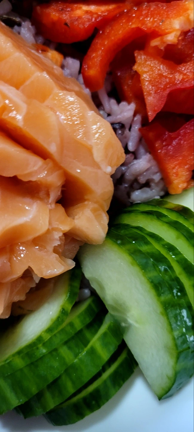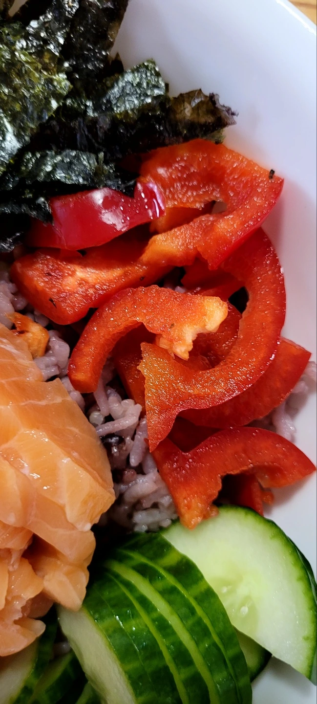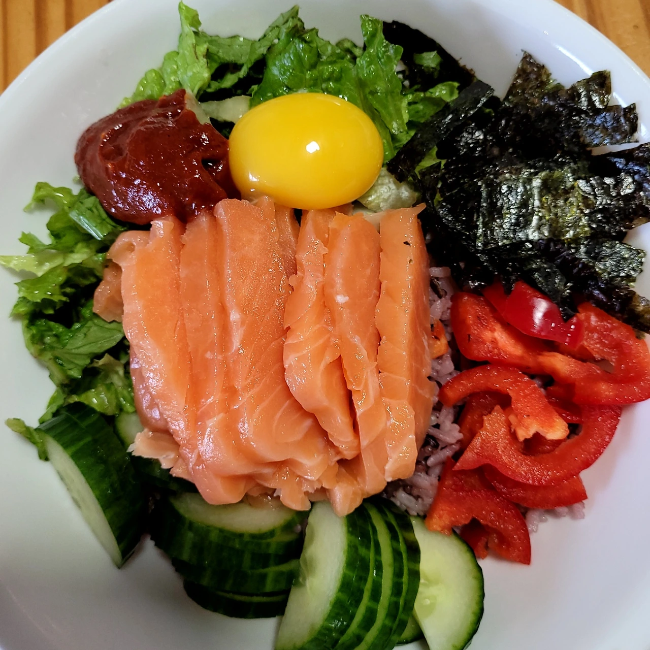 밥 위에 오이 상추 피망 순으로 가장자리에 올리고 가운데에 썰어놓은 연어를 올린다.