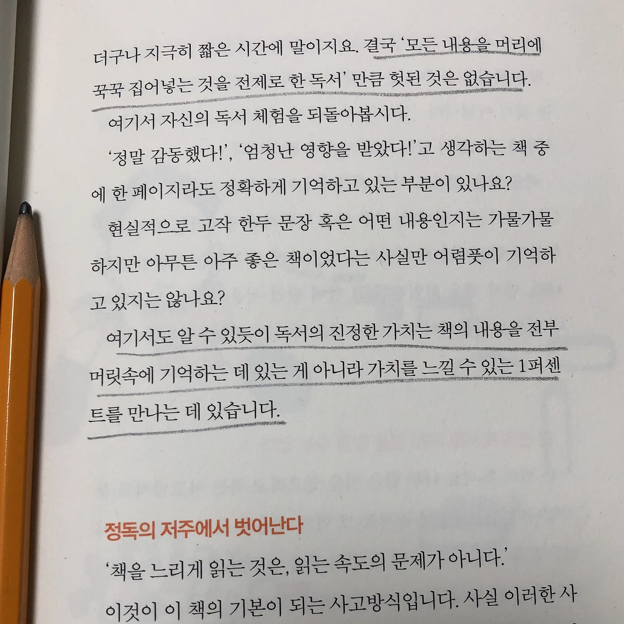 "독서의 진정한 가치는 책의 내용을 전부 머릿속에 기억하는 데 있는 게 아니라 가치를 느낄 수 있는 1퍼센트를 만나는 데 있습니다."
