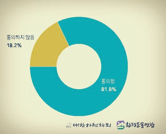 이 조사는 2019년 5월에 발표된 “4대강 보 해체 방안 발표에 따른 국민 여론조사”다. 위의 질문은 이 조사에서 가장 중요한 질문의 하나였다. 전국의 19세 이상 성인 남녀를 대상으로 16개 광역시도별 성, 연령별 인구비례할당에 의해 1,000명이 응답했는데, ‘동의한다 81.8%’, ‘동의하지 않는다 18.2%’로 보고되었다.
