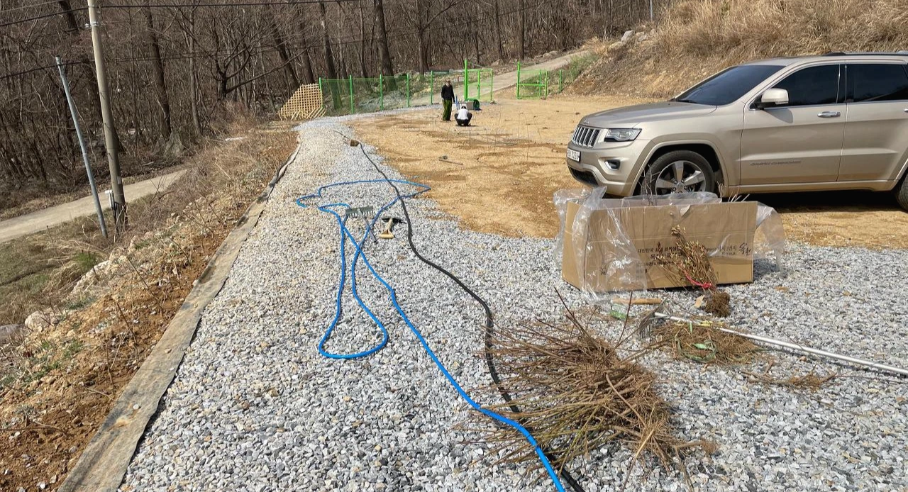 개나리는 나중에 담장 역할을 할 수 있을 것 같아서 선택했다. 담장이나 도로에 조경수로도 많이 사용하는 것 같기도 하고 옛날부터 노란 꽃이 피는 개나리를 무척 좋아했었다. 담장용으로 화살나무도 생각을 했었는데 생각보다 비용이 많이 들 것 같아서 제외했다. 개나리는 촘촘하게 심어야 하기에 골을 타듯이 전체 길이로 땅을 파고 심었다. 그리고 그 옆에는 파쇄석 밑의 부직포를 들고 그 밑에 전선을 넣어 나름 지중화 작업을 병행했다.