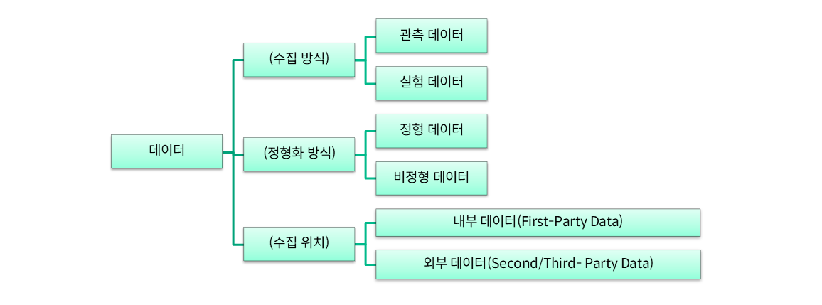 외부 데이터: 조직 외부에서 수집한 데이터로, 세컨드 파티 데이터와 서드 파티 데이터로 나뉩니다.