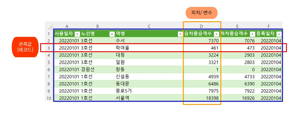 열은 데이터를 저장하는 공간이며, 이를 칼럼(column), 피처(feature), 필드(field), 또는 변수(variable)라고 부릅니다. 열은 데이터셋에서 특정한 속성을 나타내며, 예를 들어, "성별"이라는 열에는 각 개체의 성별 정보가 기록됩니다. 인공지능과 머신러닝에서는 이러한 열을 피처(feature)라고 부르며, 이는 분석에 사용할 변수입니다.