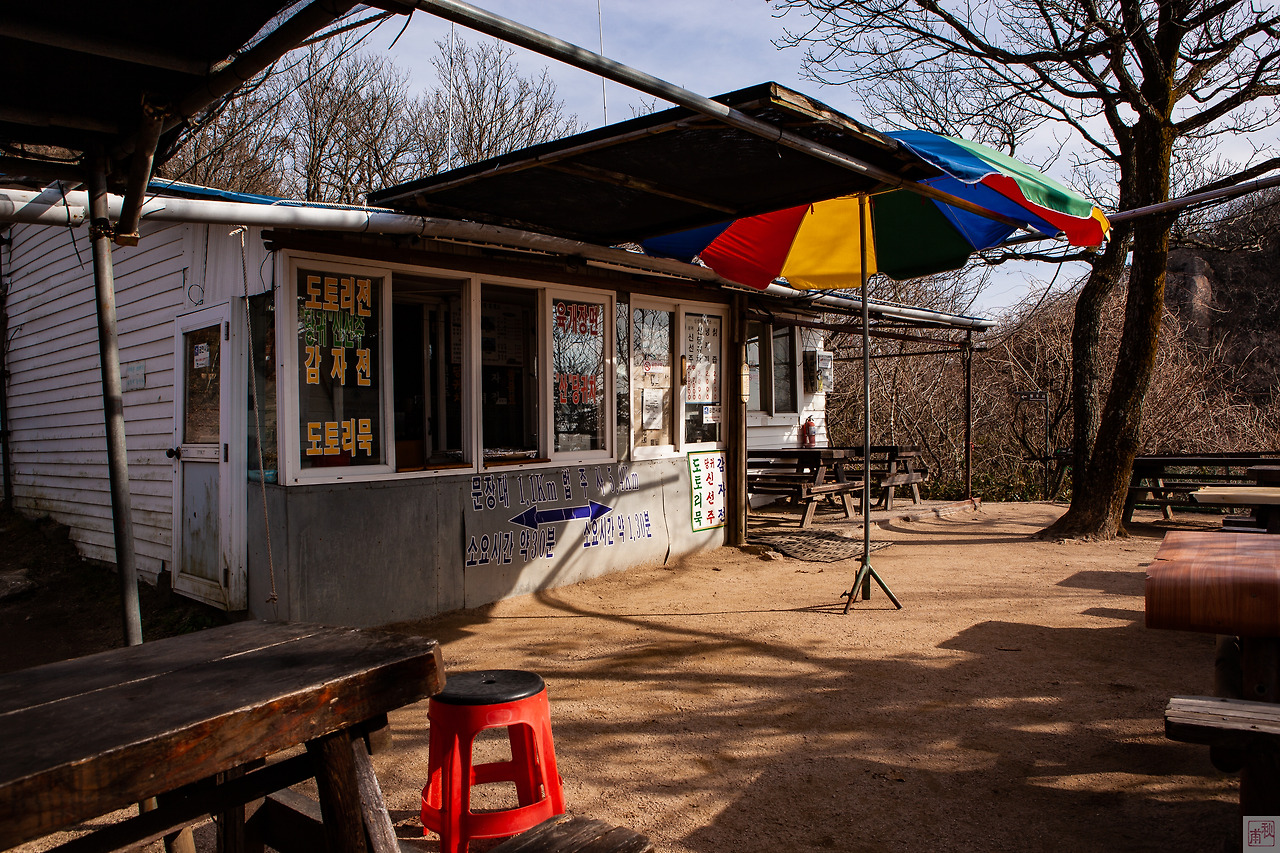 문장대에 바로 아래에는 1975년부터 문장대휴게소가 설치되어 등산객들에게 음식을 제공했으나 속리산의 생태 복원 차원에서 2008년 철거되어 지금은 등산객들이 잠시 쉬어가는 휴식처가 되고 있다. 토지주와 건물주의 반대로 소송까지 가는 어려움이 있었다고 한다. 그리고 2012년에는 통신탑과 송전탑을 철거하여 완전한 제모습을 찾게 되었다. 국립공원관리공단에서 잘한 일 중의 하나다. 그런데 여기서 남쪽으로 1.1킬로미터 정도 떨어진 곳에 신선대휴게소가 있다. 신선대((神仙臺, 해발 1,026미터)에 왜 휴게소가 있을까 고민해 보았다. 등산객으로 영업을 하시는 주인께 직접 물어보는 것은 걸례 일 것 같아 질문을 하지 못했지만 여러 가지 짐작이 된다. 아마도 국립공원으로 지정되기 전부터 휴게소 운영을 했지 않을까. 용상이의 추측이다. 지금의 주인께서 영업을 그만둘 때까지 기다려야 하나. 문장대휴게소 철거할 때 왜 신선대휴게소 철거는 논의가 되지 않았을까? 검색을 해보았지만 관련 내용을 확인할 수가 없었다. 더욱 아이러니한 것은 휴게소에서 주류를 판매하고 테이블에서 마시는 그곳 앞쪽에 국립공원관리공단에서 산행시 음주를 금한다는 현수막이 걸려있었다. 바로 그곳에서 우리도 동동주 한 사발에 도토리전으로 잠시 휴식을 취했다.