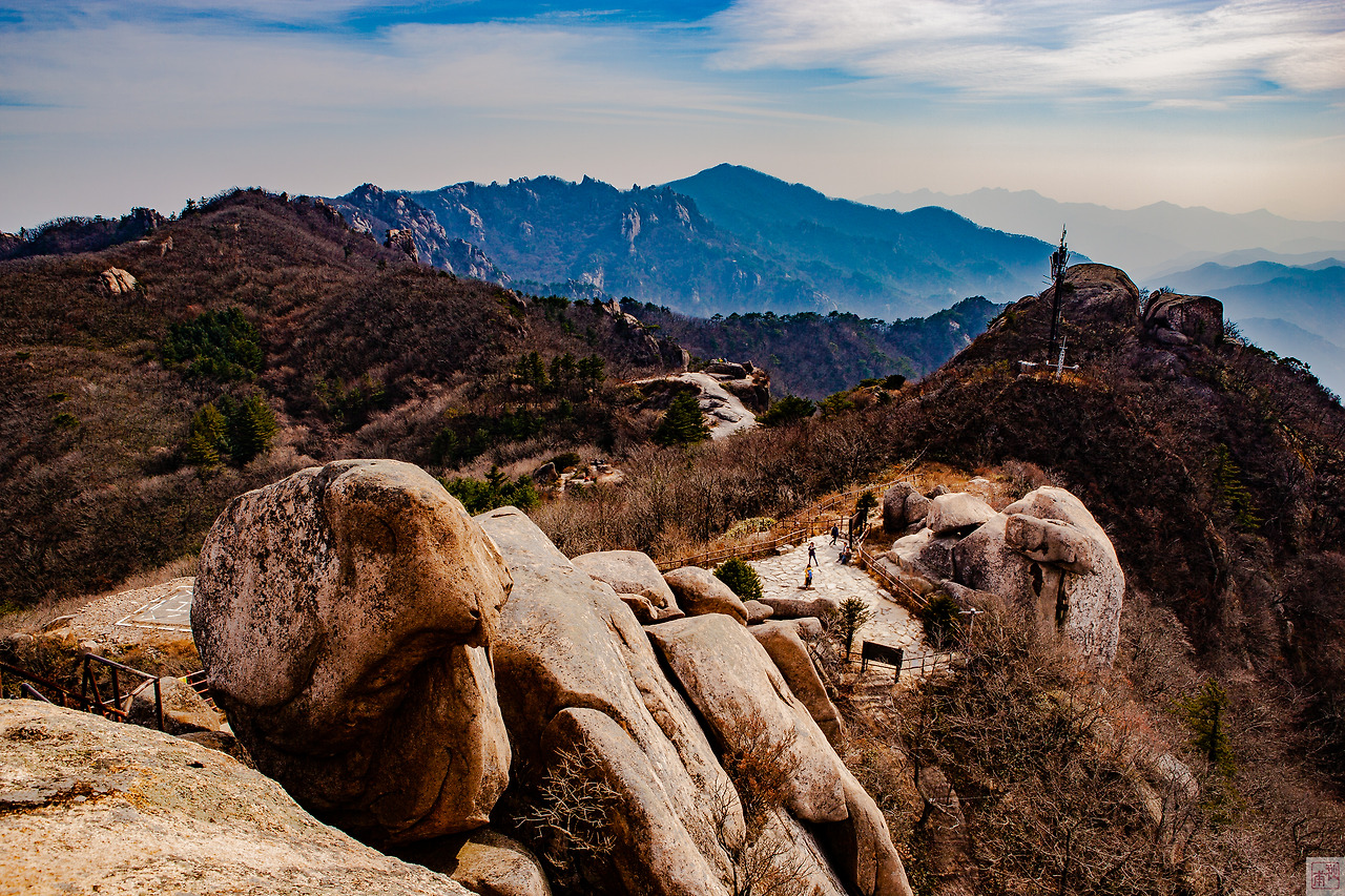 암릉지대를 본격적으로 들어서면서 화북지구와 성불사가 손에 잡힐 듯 보였다. 계곡 깊은 곳은 붉게 물든 단풍으로 타오르고 있었다. 산행을 하기 어려울 정도는 아니지만 미세먼지의 여파로 사진이 좀 흐리기는 하지만 눈으로 조망하는 풍경은 가히 최고다. 화북지구에서 문장대로 올라왔다면 아마도 단풍터널을 지나왔을 것 같다. 몇 해 전 캠핑으로 왔을 때 선후배들과 이 코스로 문장대를 오르면서 느꼈던 찬란한 단풍이 그려진다. 암릉 사이사이에서 조망되는 문장대의 뒷모습도 일품이다. 문장대에서 관음봉으로 이어진 암릉이 병풍을 두른듯하다. 어찌 보면 정면으로 보이는 문장대는 표지석도 있어서 다들 기념사진을 찍지만 가까이에 있기에 그 웅장함을 보기 어려운 측면이 있다. 산세가 험한 이곳이 문장대를 조망하기에 가장 좋은 곳이 아닌가 생각된다.