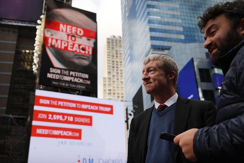 톰 스테이어가 트럼프 대통령의 탄핵을 요구하는 타임스퀘어 광고판 앞에 서있다(2017.11.20).