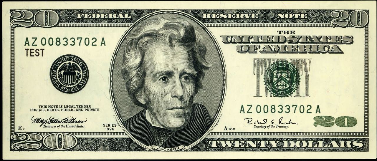 앤드류 잭슨은 미국의 20달러 지폐의 주인공이다. 잭슨이 대통령으로 선출된 지 100년이 되는 해인 1928년부터다. 그로부터 100여 년이 지났는데, 20달러 지폐의 주인공이 다른 사람으로 바뀔 수도 있다. 2021년 1월 25일 젠 사키 백악관 대변인은 브리핑에서 "재무부가 해리엇 터브먼을 20달러 지폐 앞면에 넣으려 다시 조치를 하고 있다"라고 발표했다. 그리고 이렇게 덧붙였다.