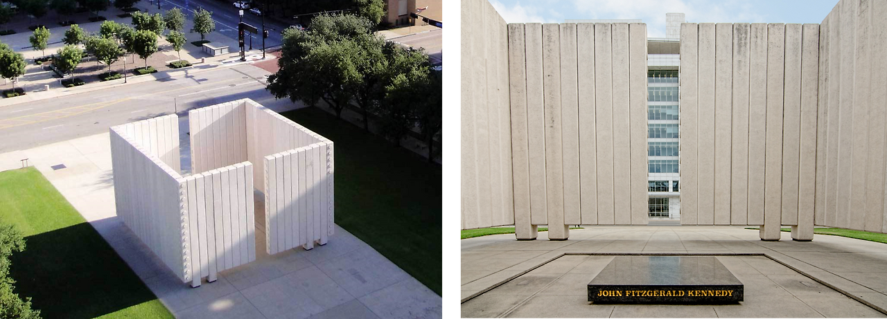 케네디 대통령이 저격당한 장소에서 한 블록 떨어진 곳에 <존 F. 케네디 메모리얼>이라는 추모 조형물이 있다. 너무나 수수해서 번쩍이는 초고층 빌딩 사이에서 되레 눈에 띈다. 소박한 디자인으로 설계해달라는 케네디가의 요청에 따라 건축가인 필립 존슨이 위가 뚫린 상자 같은 단순한 형태로 완성했다고 한다. 안으로 들어가 보면 아무런 설명도 없이 케네디의 이름이 새겨진 검은색 화강암 비석판이 바닥에 덩그러니 놓여 있다. 사방이 뚫린 개방형 묘에 가깝다. 사람들은 이곳을 ‘조용한 피안의 장소 a Place of Quiet Refugee’로 부르기도 한다. 아마도 혼잡한 도심 속에서 하늘을 조용히 벗 삼아 편안히 잠들기를 희망하는 듯하다.