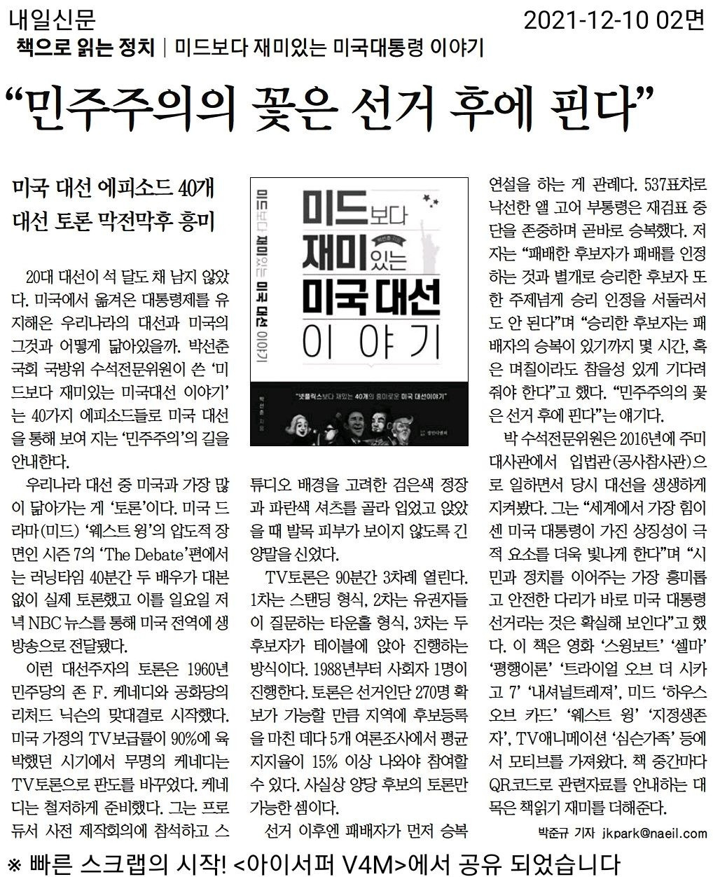 “다소 엉성해 보이지만, 선거를 둘러싸고 벌어지는 수많은 에피소드는 한 편의 드라마와 같습니다. 미국 대선은 살아있는 콘텐츠의 저수지이기 때문이죠.” 박선춘 수석은 “이 책이 복잡한 미국 대선 제도를 이해하는 나침반 역할을 했으면 좋겠다”고 말했다.