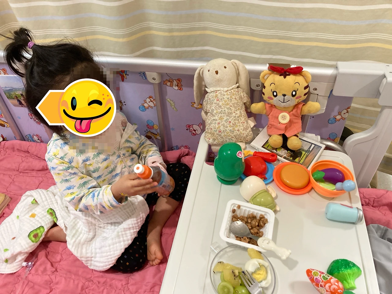 어제부로 식욕도 돌아오고 병원에서도 놀 수 있는 책과 장난감들도 있어서 이런 분위기로 지내고 있으니 너무 걱정은 마시구요.