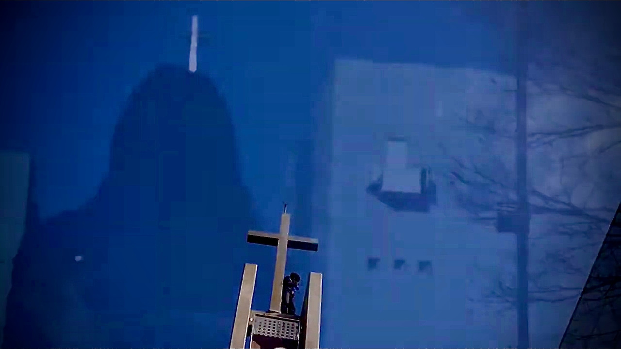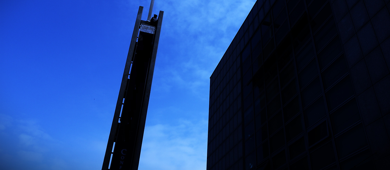 5층 건물의 높이의 탑에 걸터 앉아 카메라를 한 손으로 잡고 촬영을 계속한다.