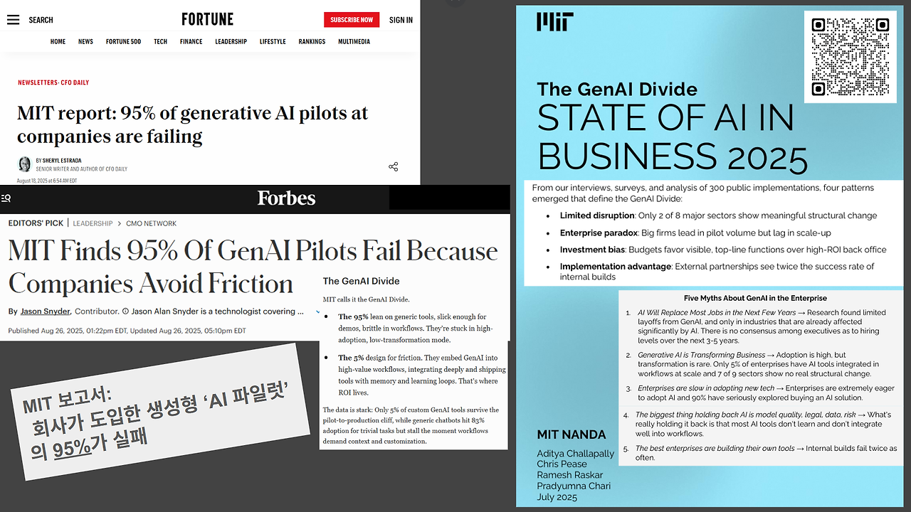(5) MIT의 또 다른 연구에서는 생성형 AI 파일럿들이 95%가 실패하고 있다는 연구를 내놓기도 했다. 이번 연구는 150명의 경영진 인터뷰, 350명의 직원 설문조사, 300건의 공개된 AI 도입 사례 분석을 바탕으로 성공 사례와 답보 상태의 프로젝트 사이의 뚜렷한 격차를 보여준다.
