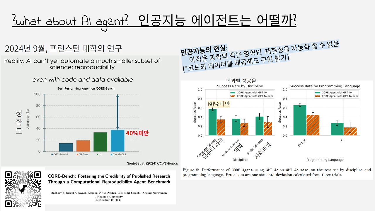 컴퓨터 과학 분야에 적용하여 연구결과를 검증하는 작업에 투여된 AI에이전트들은 GPT4부터 클로드 3.5까지 모두 40% 미만의 성공률을 보여줬다. 코드와 데이터가 제공되었음에도 과학 실험의 재현성이라는 영역에서 활용되지 못했다.
