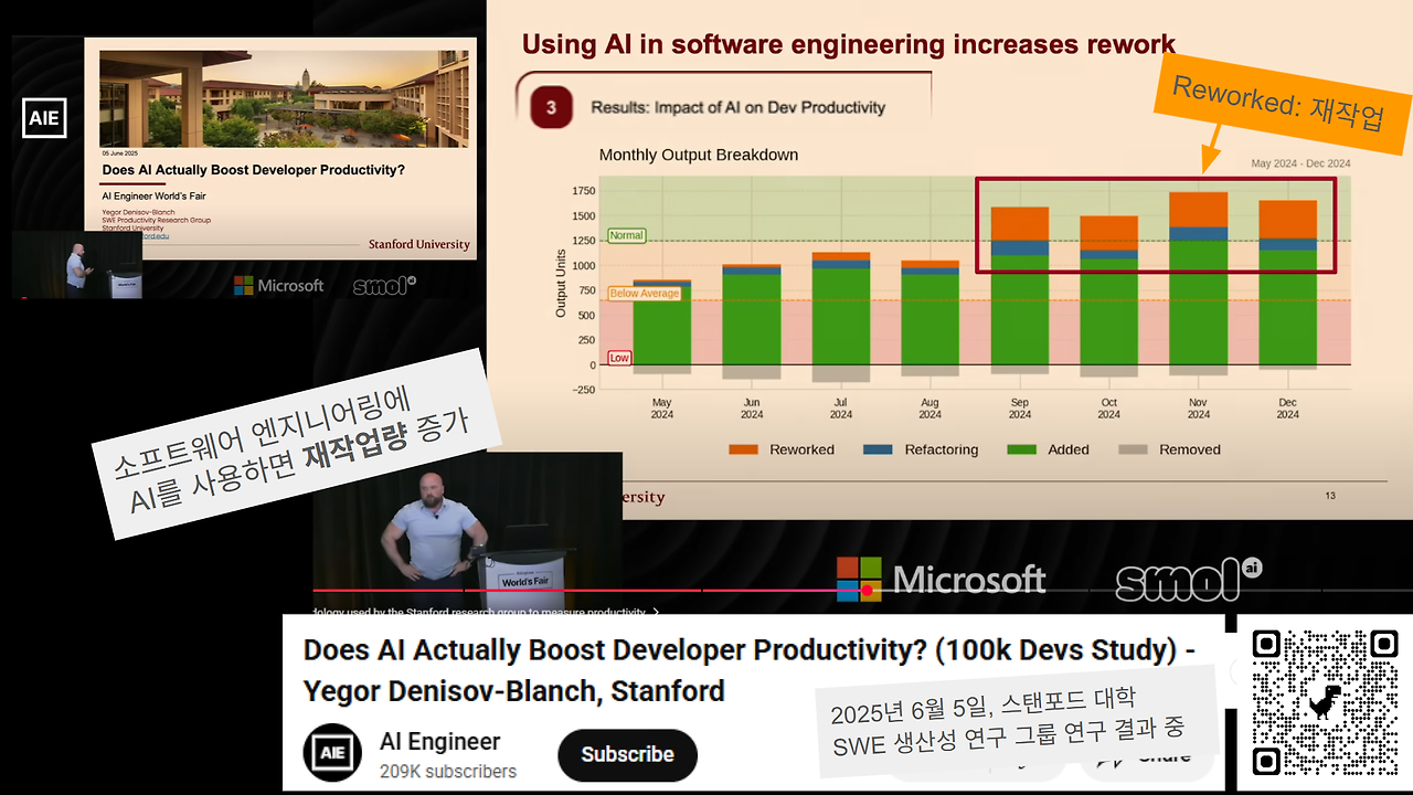 (4) 2025년 6월5일 스탠포드 대학의 생산성 연구그룹 연구 결과에선 인공지능을 실제로 도입했을 때 생산성이 얼마나 증가했는 지 결과를 발표했다. 아래 그래프의 주황색이 ’재작업‘한 비중이다. 오히려 인공지능을 통해 작업했을 때 재작업율이 상승한 것을 볼 수 있다.