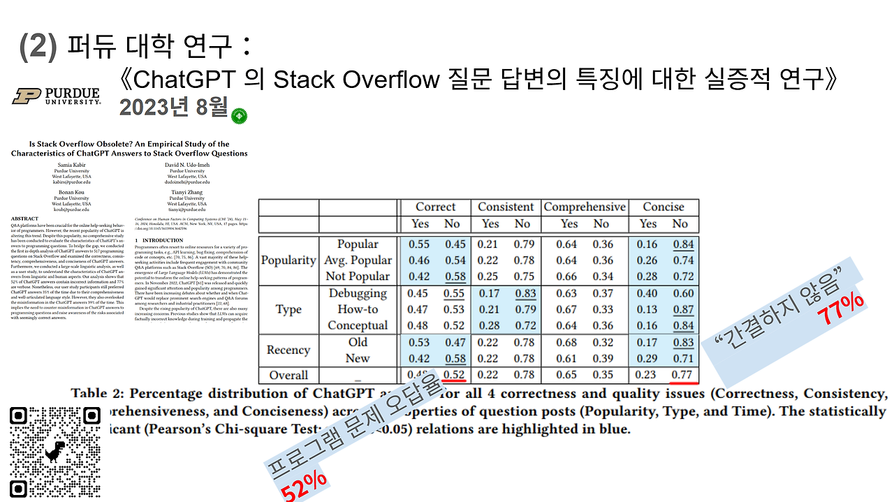 (2) 미국 퍼듀 대학에서는 챗GPT의 프로그램 문제들의 해결능력을 파악하기 위해 진행한 연구를 보자. 이 연구에서는 챗GPT의 오답율이 52%이고 간결한 답변이 가능한 문제에도 77%이상 장황한 코딩을 했다는 걸 보여줬다. (2023년 8월)