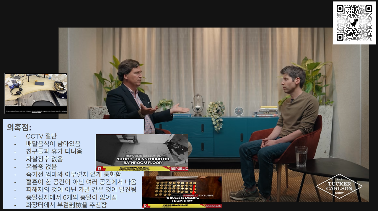 2025년 1월 경, 미국의 한 정치인/유튜버 터커 칼슨은 사망한 직원의 어머니와 인터뷰를 하며 유족이 제시하는 의혹들을 알렸다. 그 후 수개월이 지난 9월, 이 채널에 샘 올트만이 직접 출연하기도 한다.