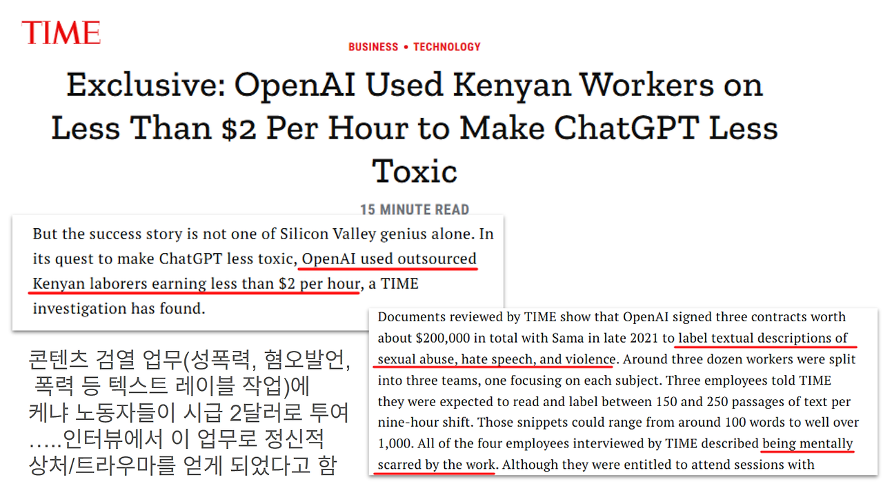 (2) 노동의 착취 - 머신러닝시 필수인 데이터 라벨링과 콘텐트 검열을 저임금노동자를 통해 진행한다