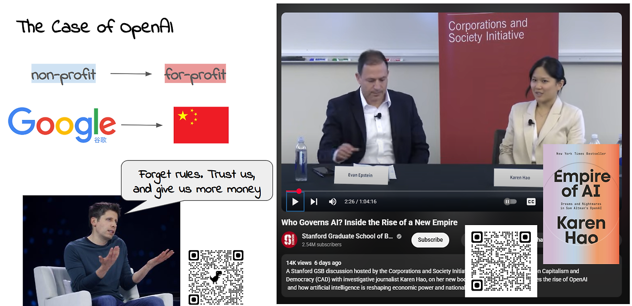 오픈AI는 비영리적(non-profit) 단체로 시작되었고, 당시에 ‘오픈소스’로 연구되고 개발되었다. 그리고 지금은 비영리 단체 내 영리조직(capped profit)이 생기는 기형적인 구조가 되어 문제가 되었다.