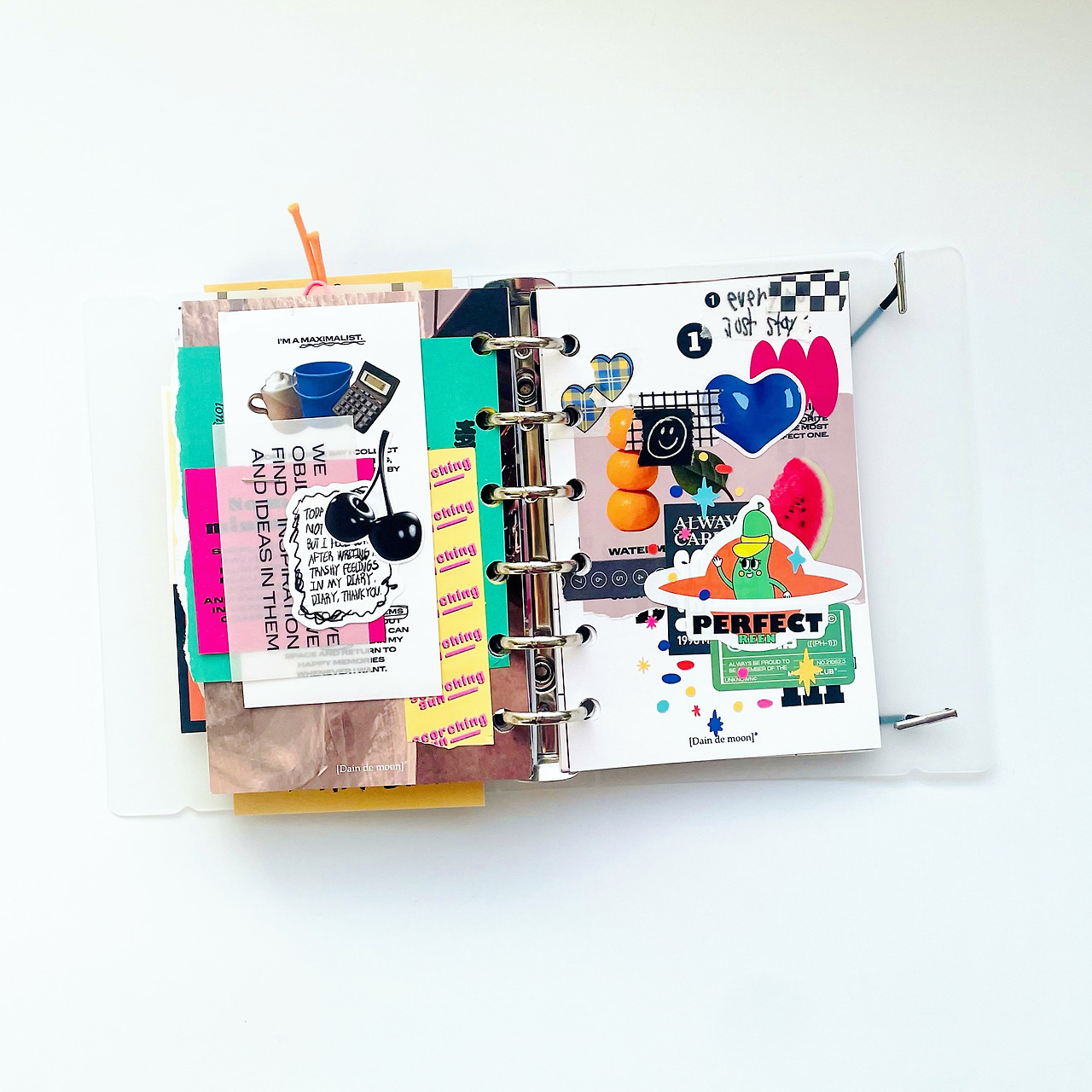 PVC 재질의 비닐로 된 6공 다이어리. 친구가 몇 장의 속지를 꾸며서 끼워주었고, 나는 친구의 솜씨에 감탄하며 몇 장을 팔락팔락 넘겨보았다.
